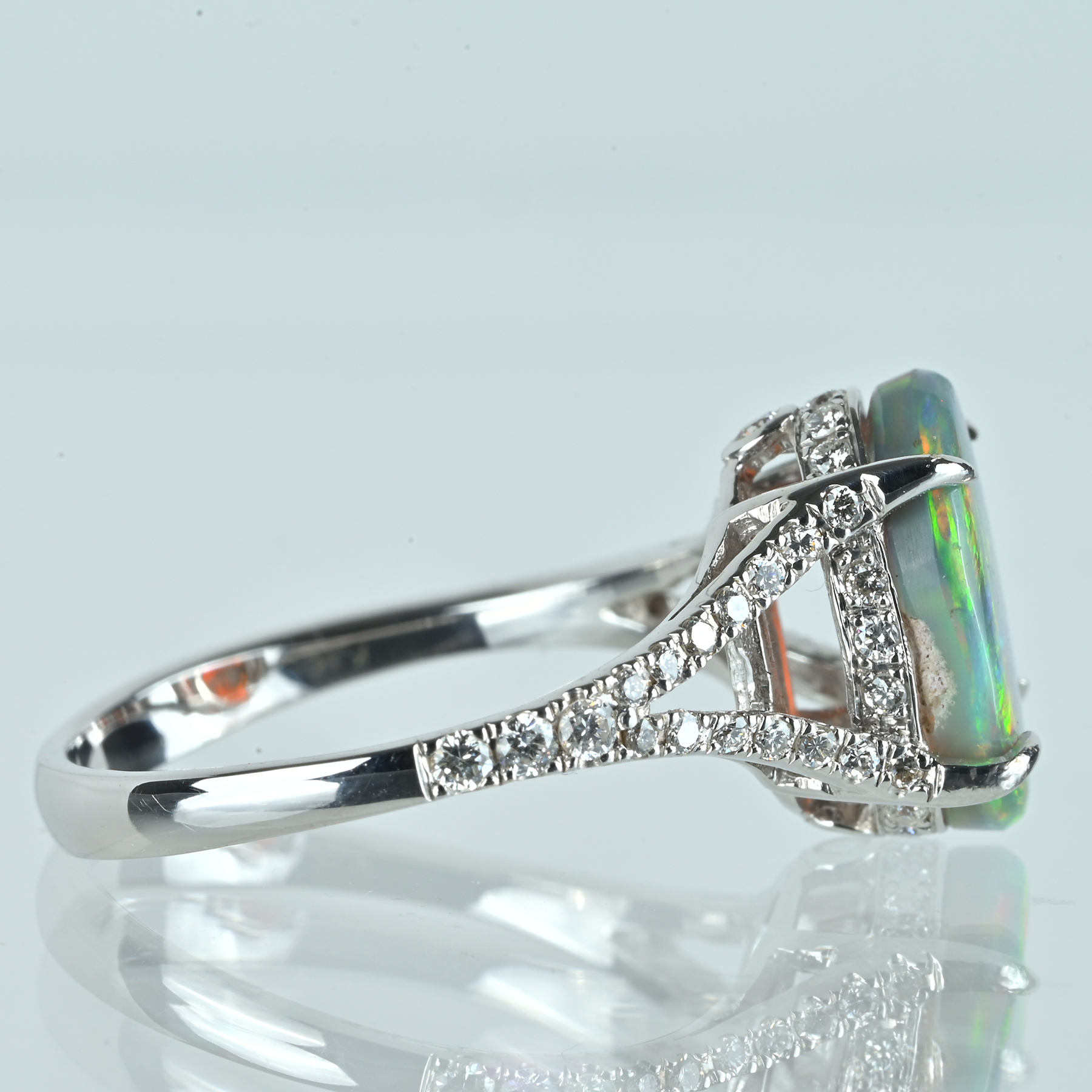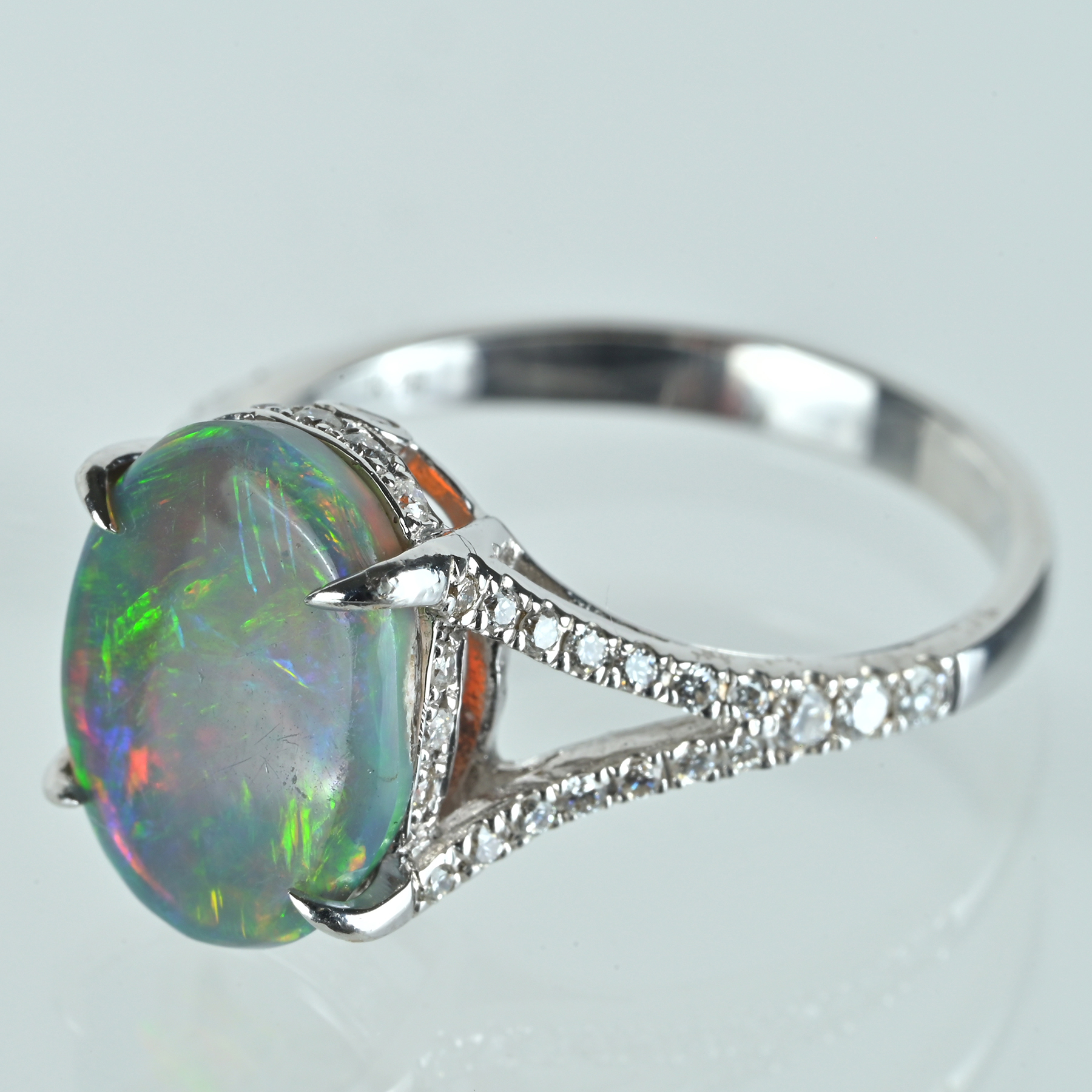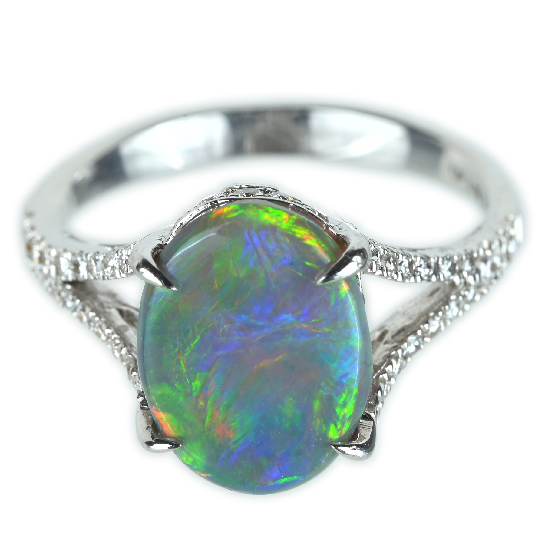 落ち着いた地色の上に濃淡あるブルー、パープル、グリーン、イエロー、オレンジ、ピンクなど、多彩な斑模様を大胆に浮かび上がらせる2.10ctのブラックオパールと、サイドに散りばめられた0.40ctのダイヤが澄んだきらめき演出するK18WGリング。