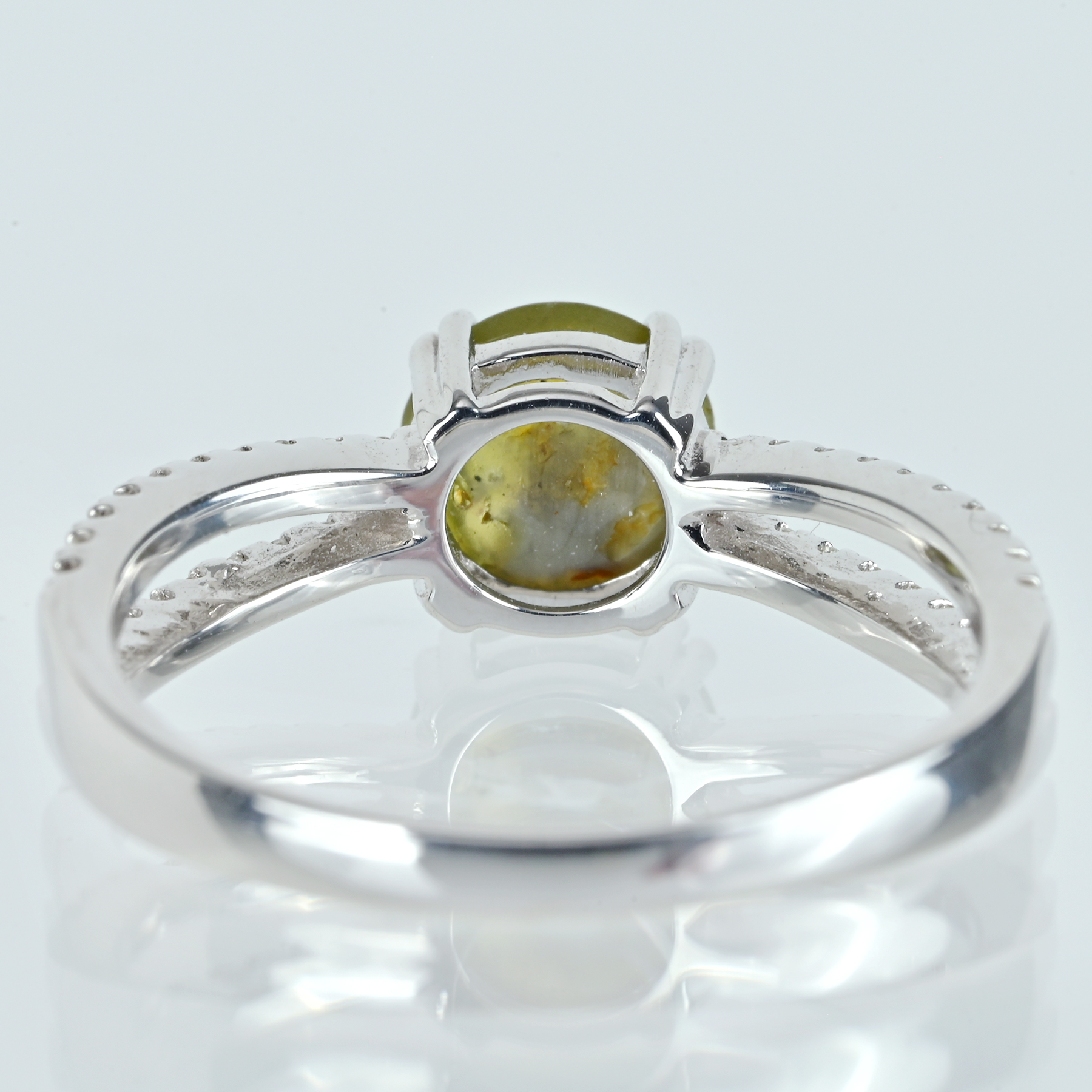 グリーンを帯びた飴色が、艶を含んで深く映るクリソベリルキャッツアイ1.76ctをセンターストーンに、ダイヤモンド0.20ctを添えたK18WGリング。艶の奥に透明感と渋みが重なり、一本のシャトヤンシーがくっきり芯へ真っ直ぐ走って視線を引き寄せる。つるりとしたカボションが光を束ね、爪の陰影で猫目ラインを際立たせた一品。