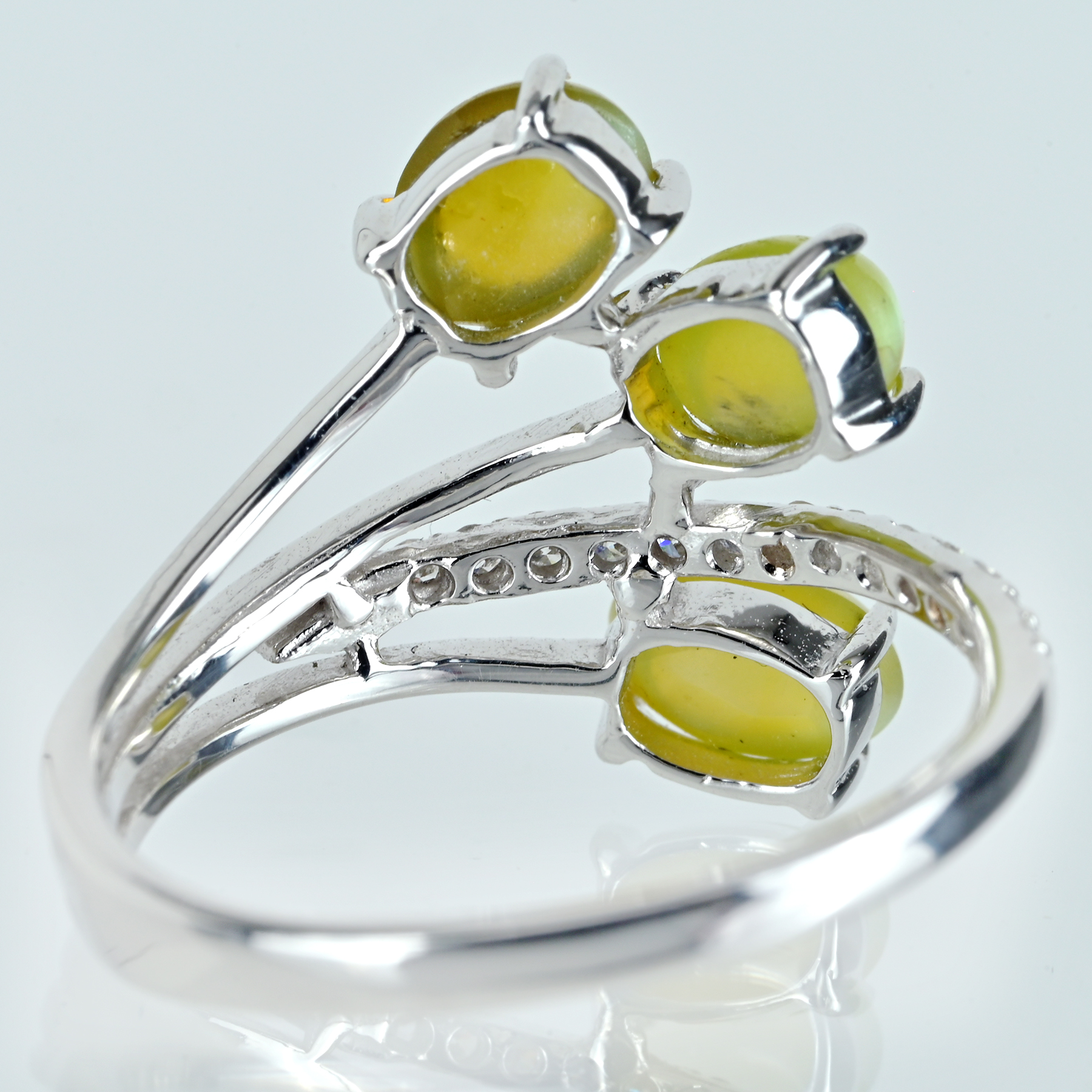 飴色からグレイッシュグリーンまで表情の異なるクリソベリルキャッツアイ3ピース計2.55ctを主役に、ダイヤモンド0.12ctを添えたK18WGリング。いずれも芯へ吸い込まれる艶の奥で猫目ラインがくっきりセンターに立ち、色味の違いが光の移ろいを豊かにする。つるりとしたカボションが光を束ね、流れるアームが三石を軽やかに巡らせる上質な一品。