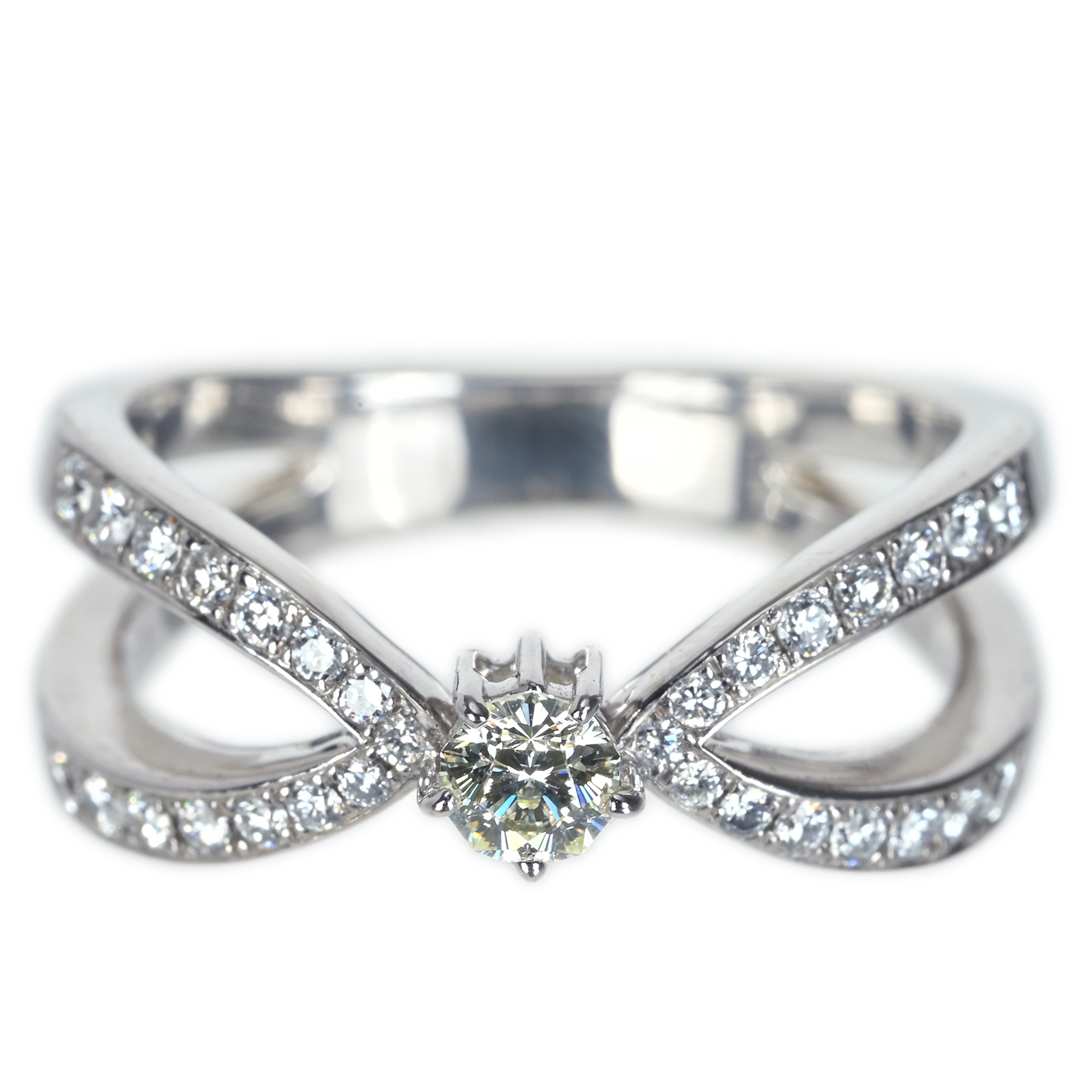 センターに据えたさくらカットダイヤモンド0.176ctは微かに黄色味を帯び、繊細なスプリットアームにメレダイヤ0.25ctが端正に飾られるK18WGリング。さくらカットと呼ばれる意匠は、トップから覗けば桜の花弁を思わせる光の広がりが見えやすいとされる。特徴的なシルエットが視線を中央へ束ね、輝きの表情をすっきりと際立てる一品。