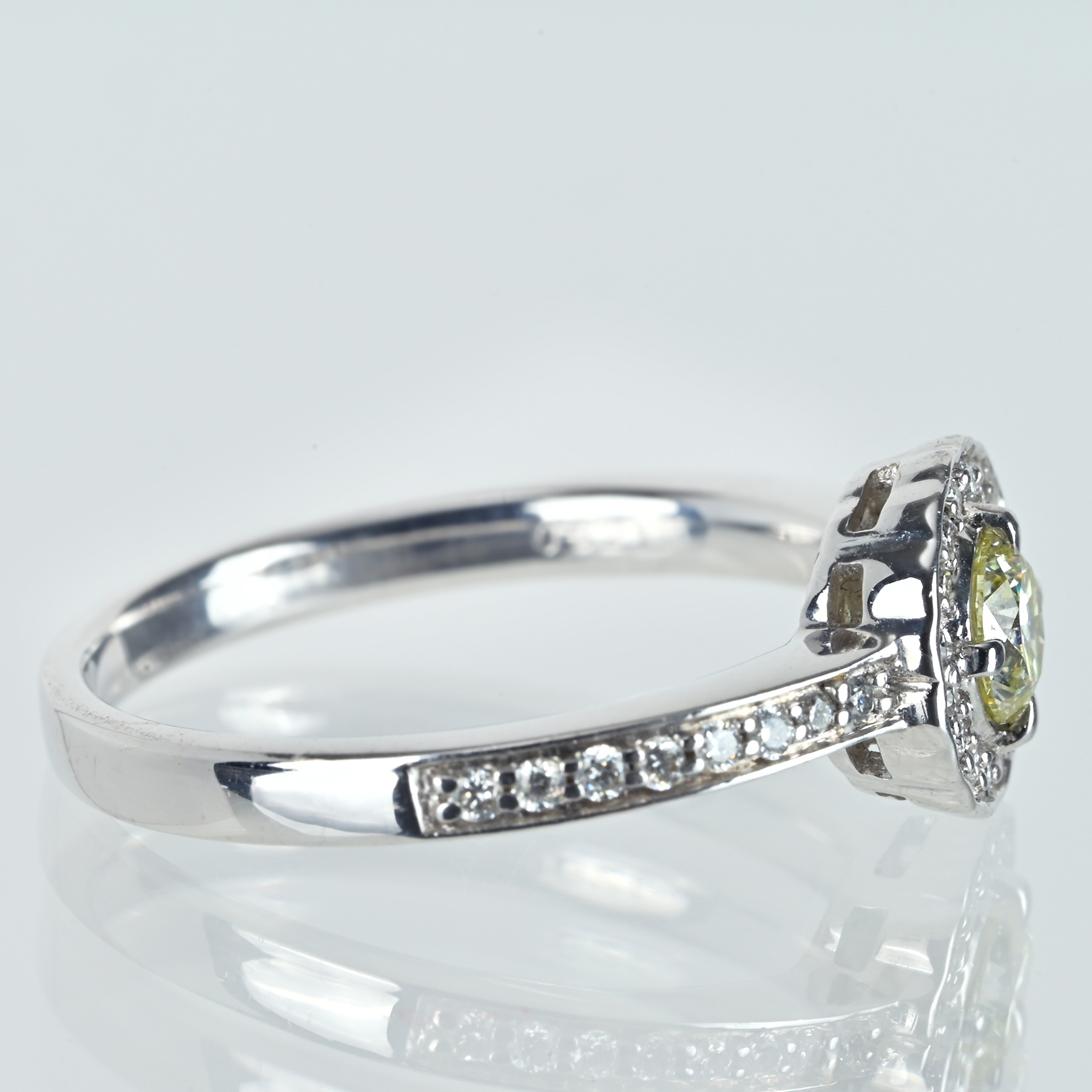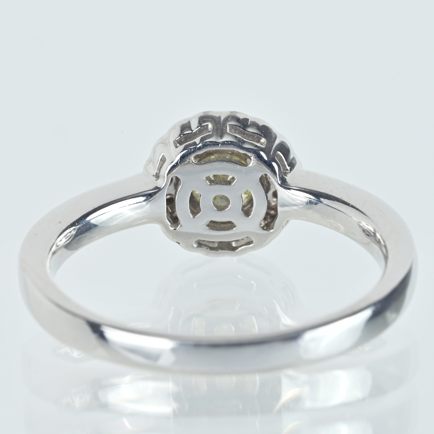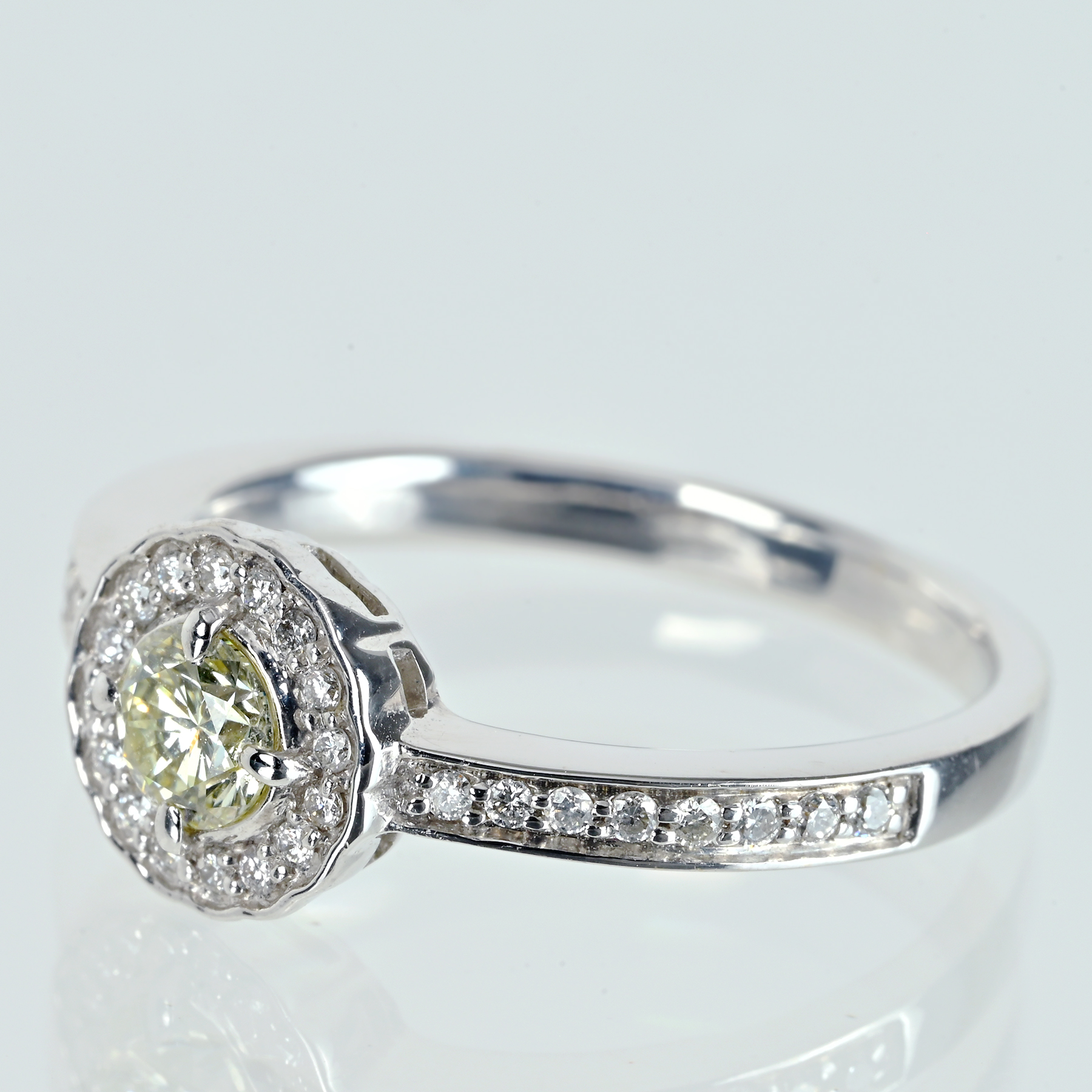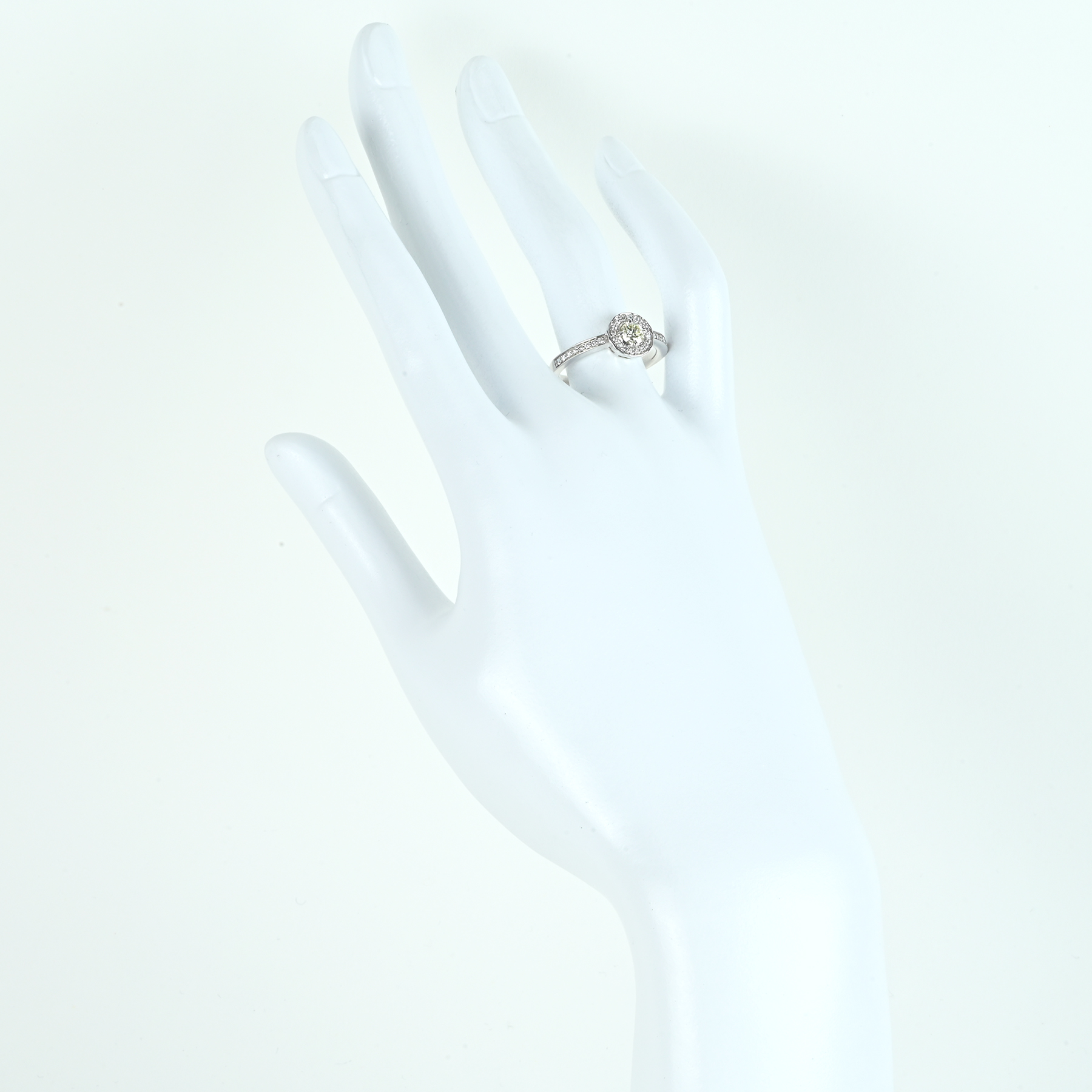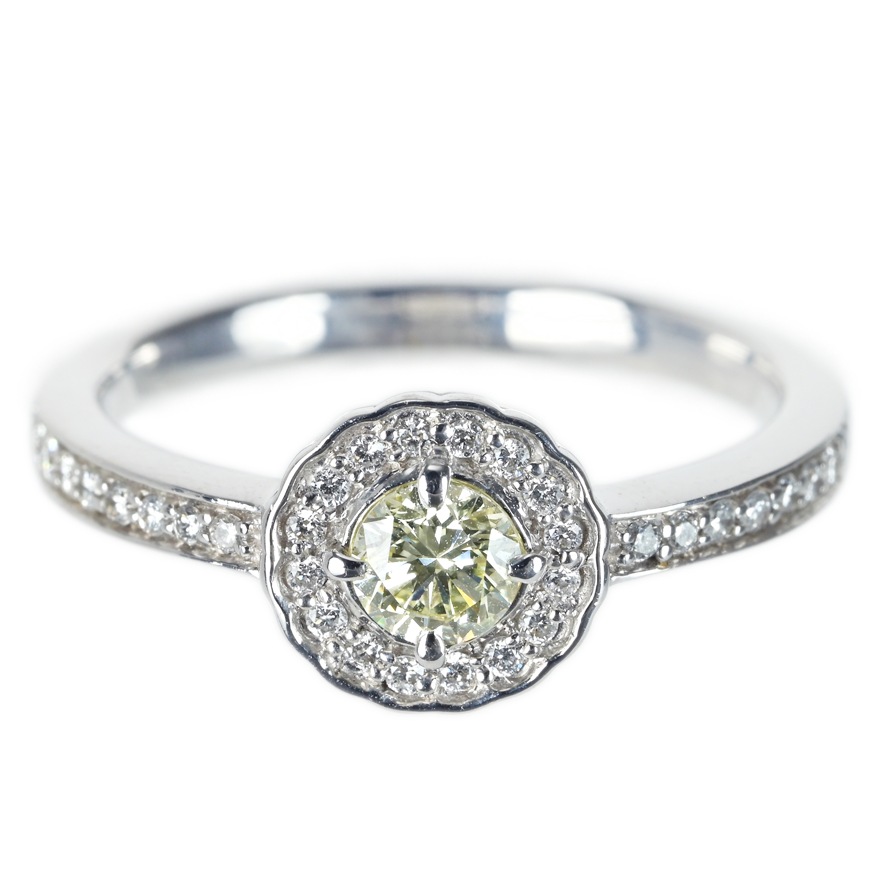ほんのりと黄色味を帯びたダイヤモンド0.321ctを主軸に、ダイヤモンド0.16ctを添えたK18WGリング。ルーペレベルでもインクルージョンが目に残りにくく、透明な輝きが芯へまっすぐと伸びる。花びらのように縁取る取り巻きが光の粒を集め、メインストーンを上品に引き立てる一品。