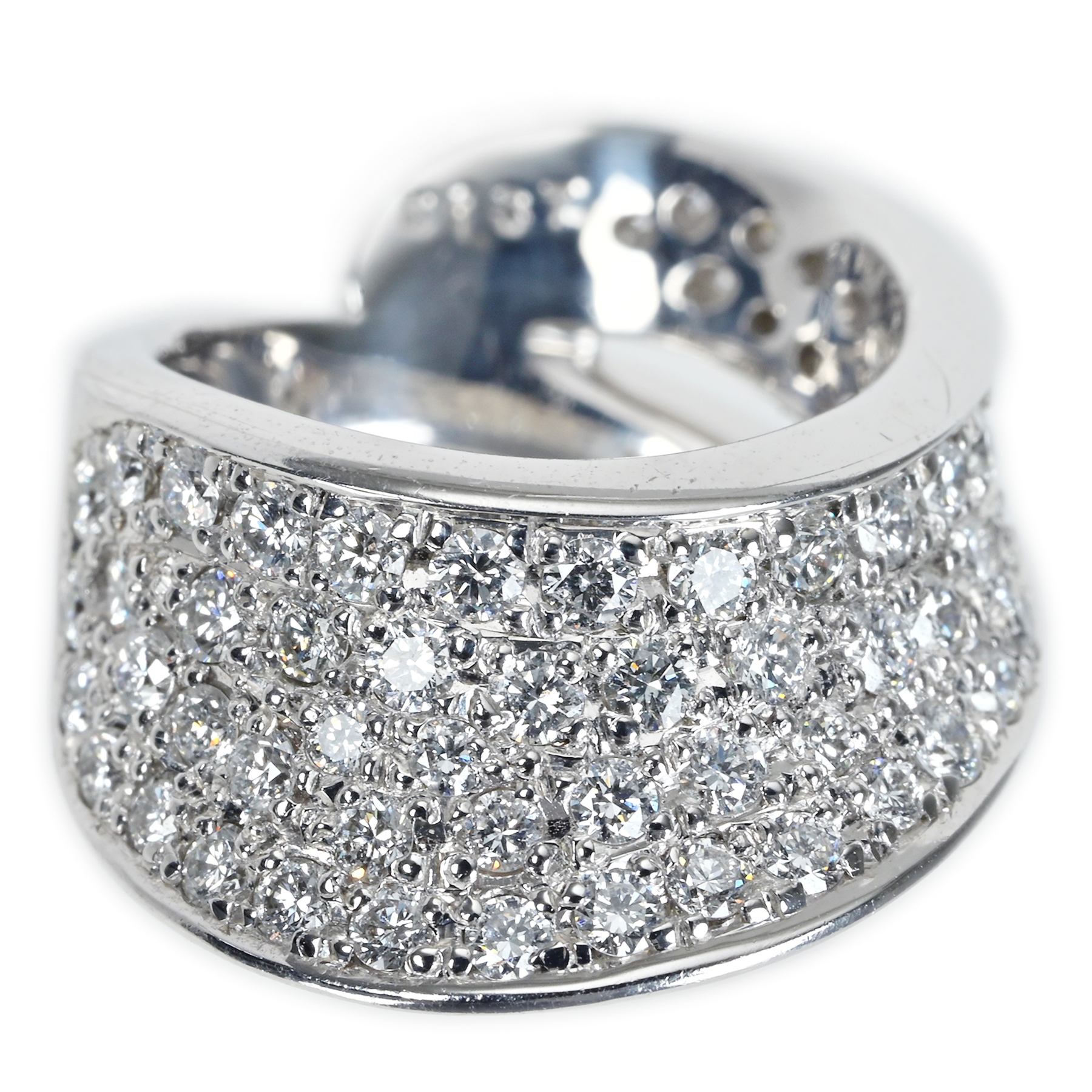 粒の連なりが繊細に散って華やぎを整え、滑らかな地金の艶がきらめきの輪郭を引き締める。ホワイトゴールドの艶が造形を端正に整え、装いにも上質な余韻。背面の透かしが光を招き、重量9.8gの確かな量感が指元に落ち着いて収まり、静かなきらめきが続く。