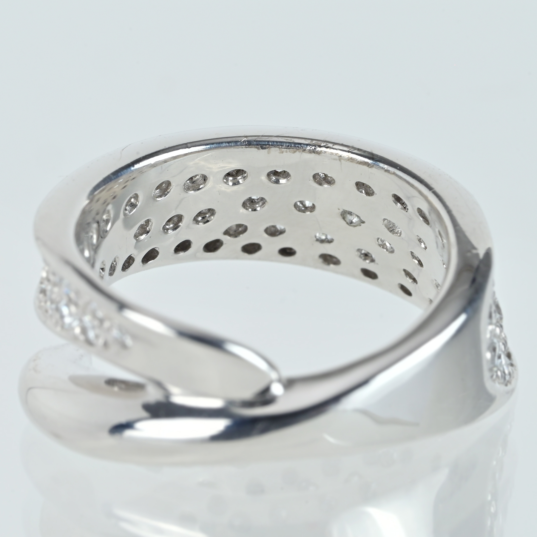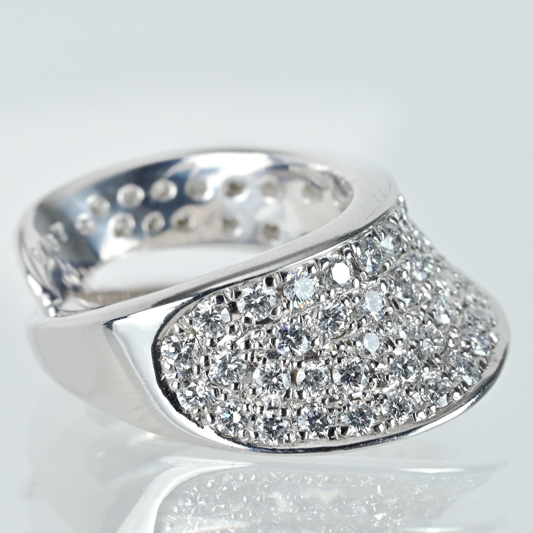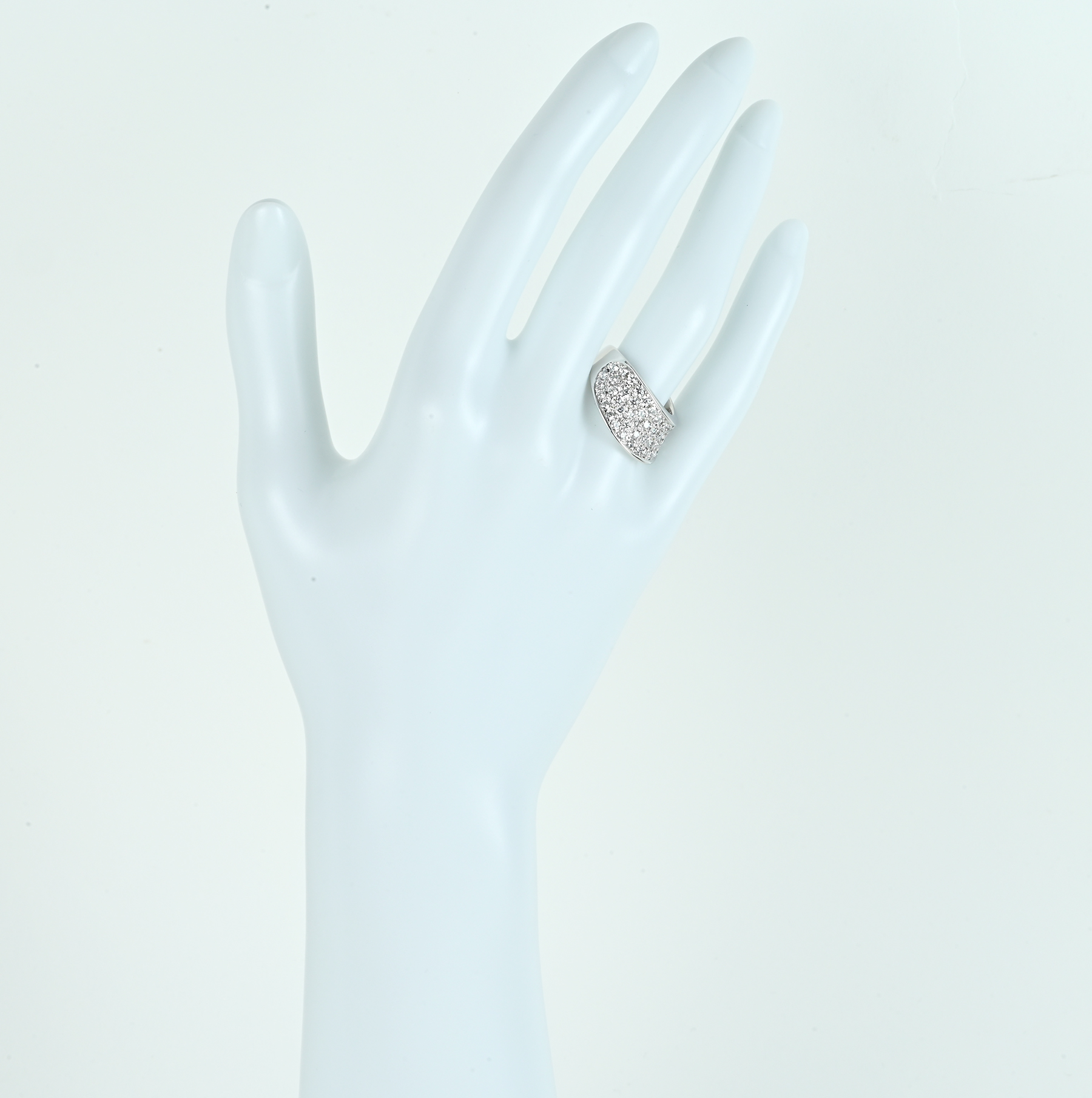 全58ピース計1.37ctのダイヤモンドをパヴェ状にセッティングしたK18WGリング。熟練した職人の手による「彫り留め」の技術が石を丁寧に支え、光を点で受け渡しながら立体へ広げる。緩やかなSラインの稜線が視線を導き、輝きの密度を上品に抱え込む一品。
