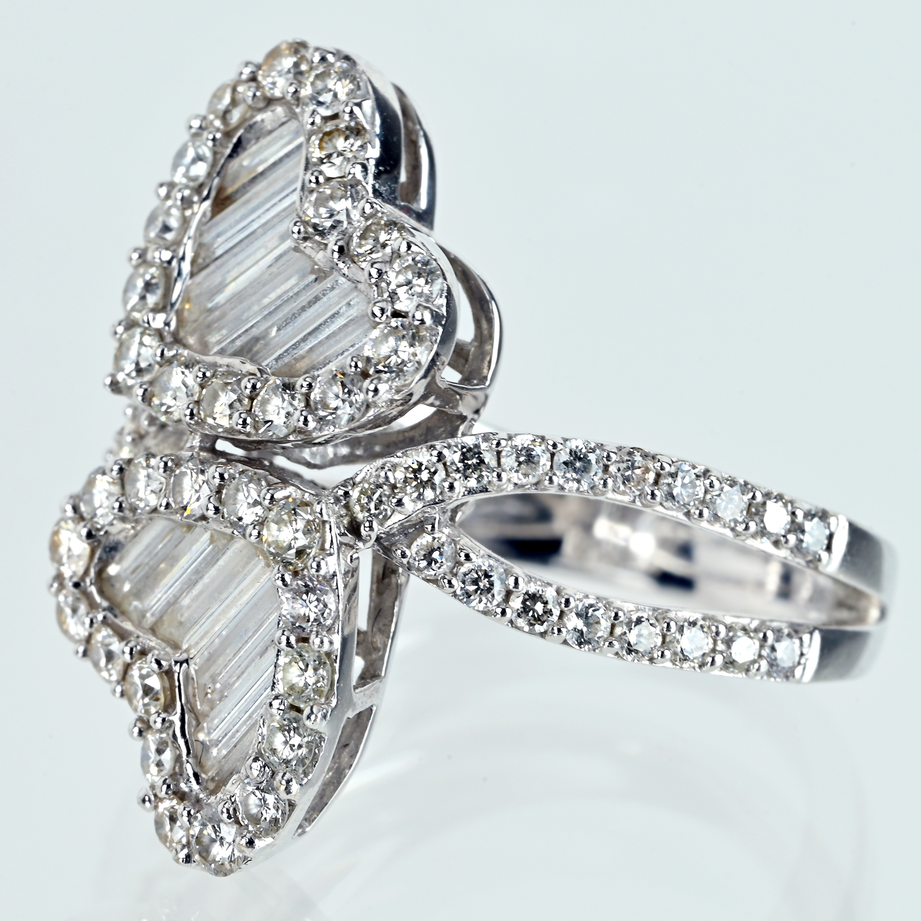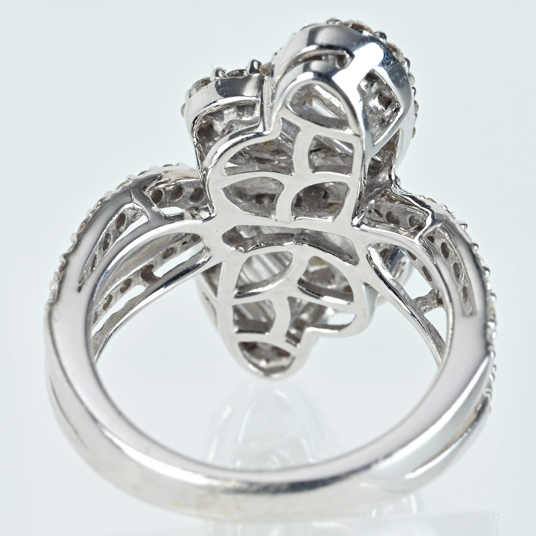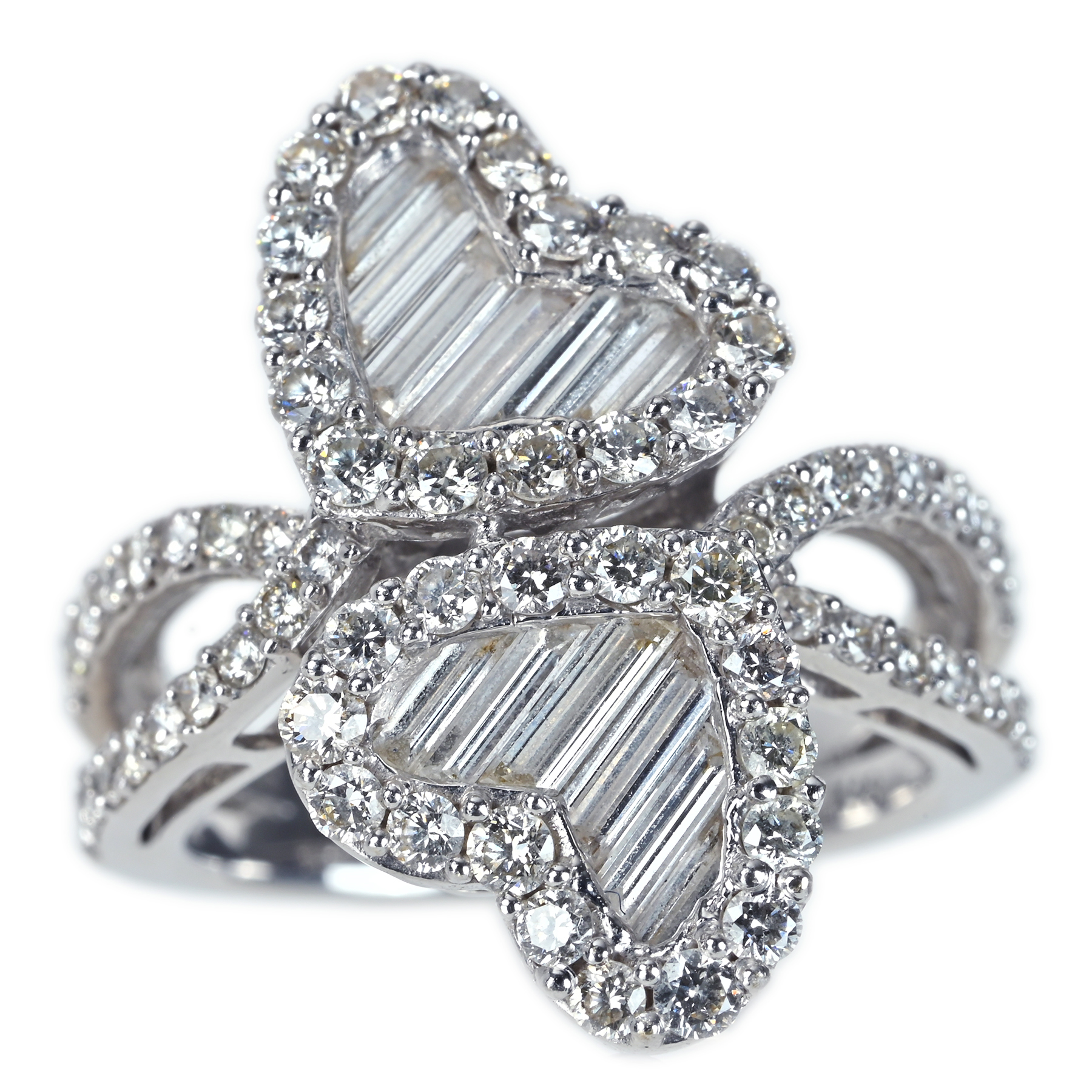 カラーレスの澄んだ輝きが織りなす全78ピースのダイヤモンド計1.56ctを束ねたK18WGリング。濁りのない抜けが芯で跳ね返り、インクルージョンを意識させない輝きへまとまる。寄り添う二つのハートとライン状に揃えたカットが端正な光の筋を描き、取り巻きの粒立つきらめきが輪郭を縁取る一品。