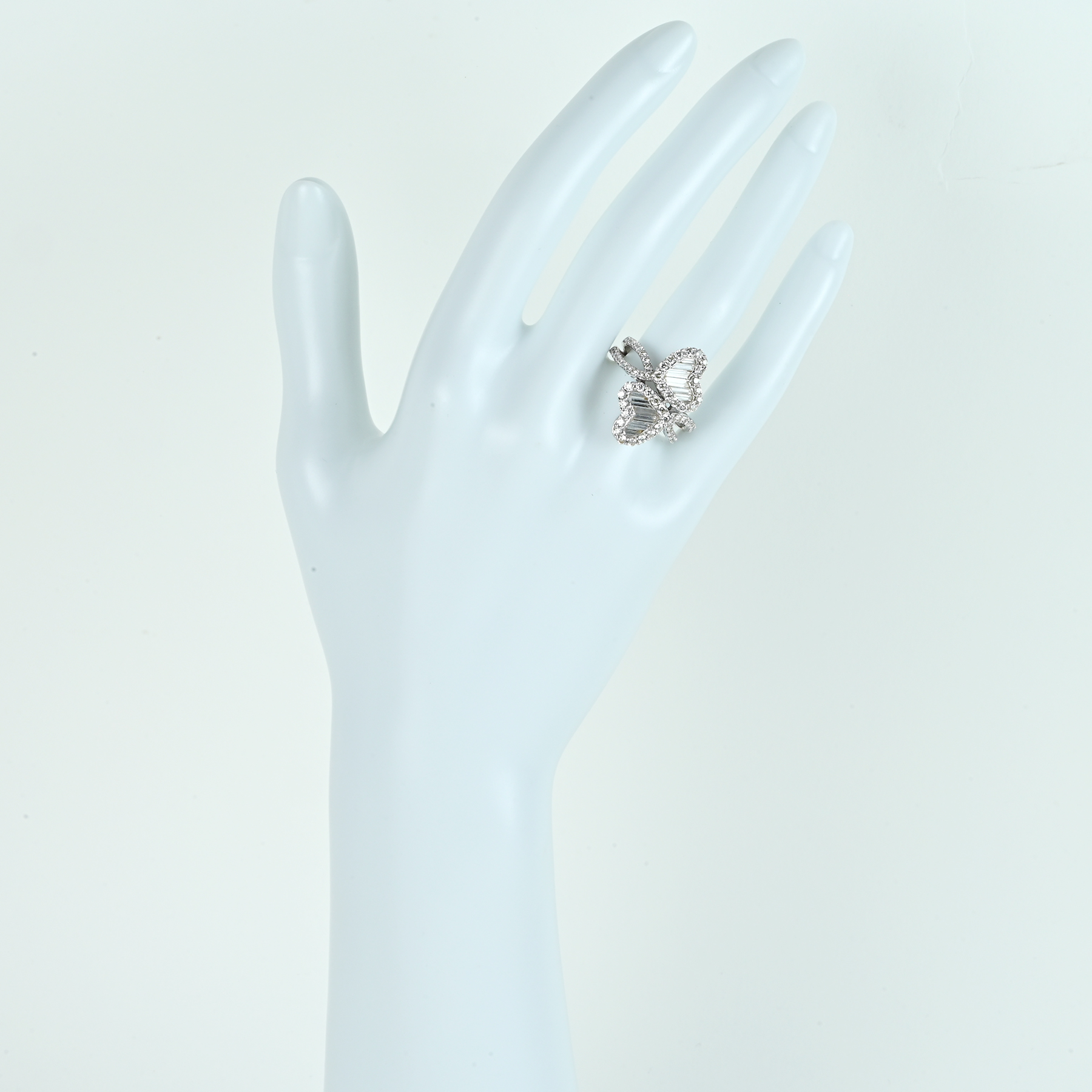 スプリットアームに散りばめられたメレダイヤが細かな光を連ね、ハートモチーフの存在感へ華やぎを添える。ホワイトゴールドの冴えた艶が全体をすっきり整え、装いにも研ぎ澄む印象。背面の透かしが光を招き、総重量6.0gのバランスで指元へすっと沿い、主張を抑えて格を示す。