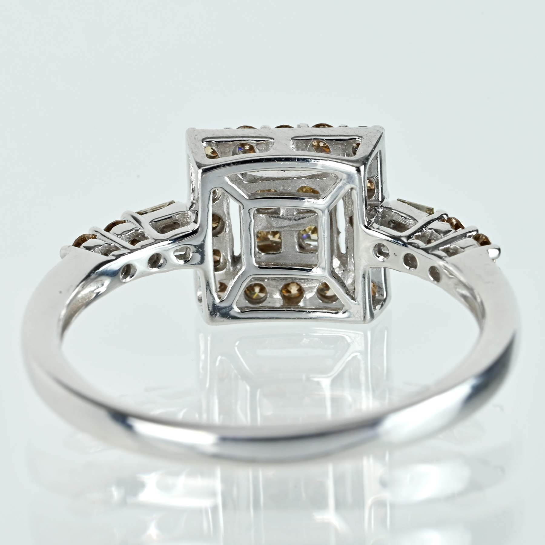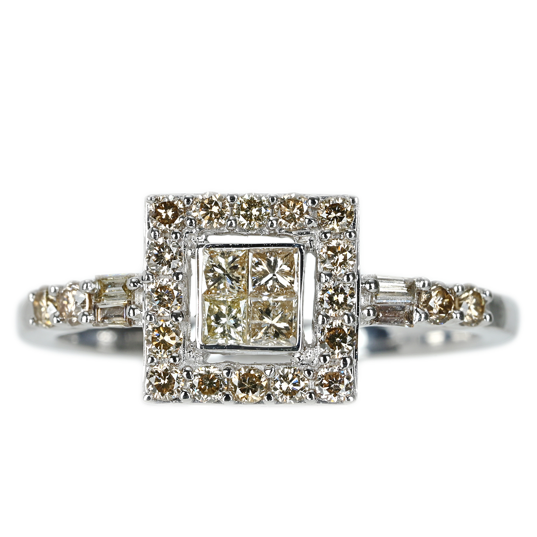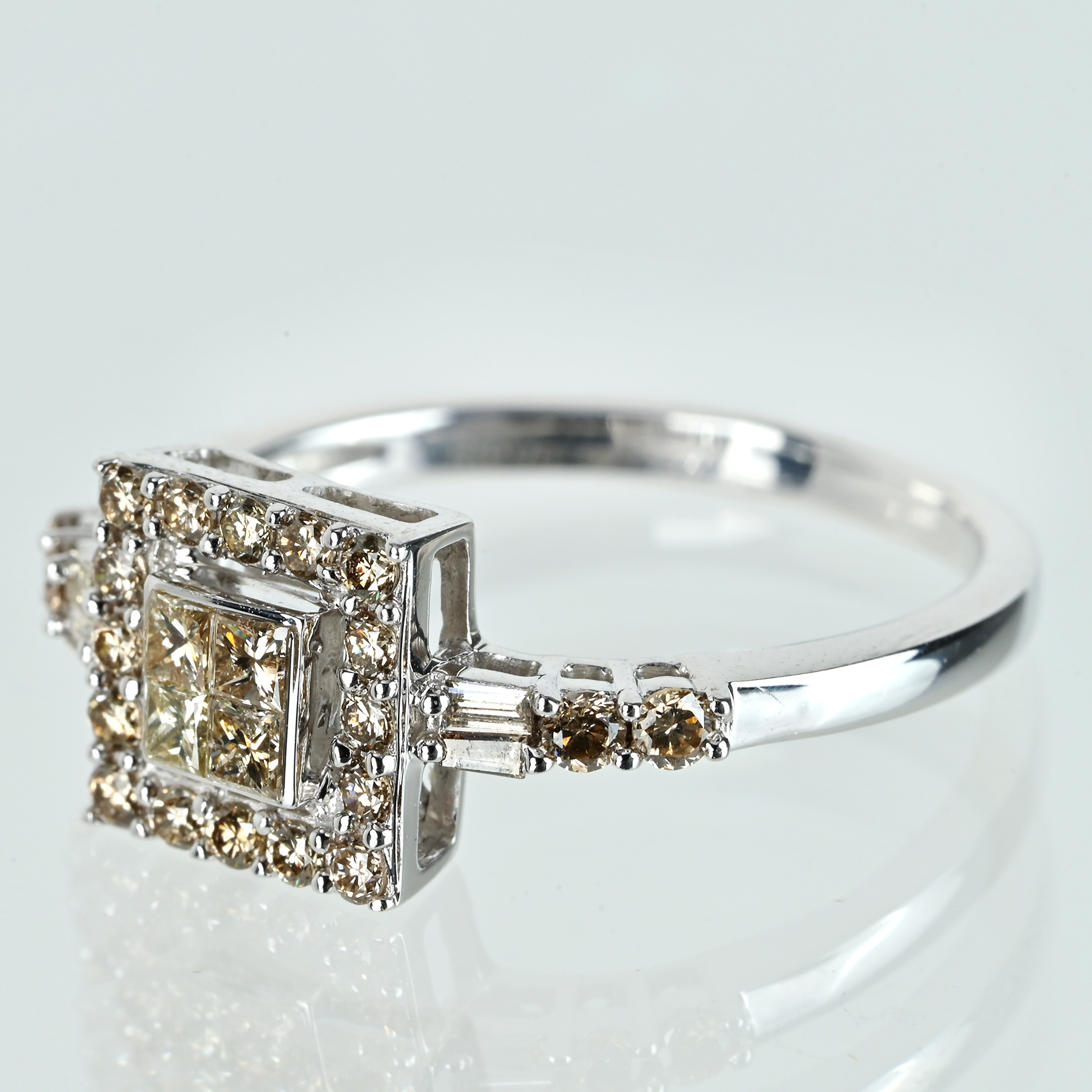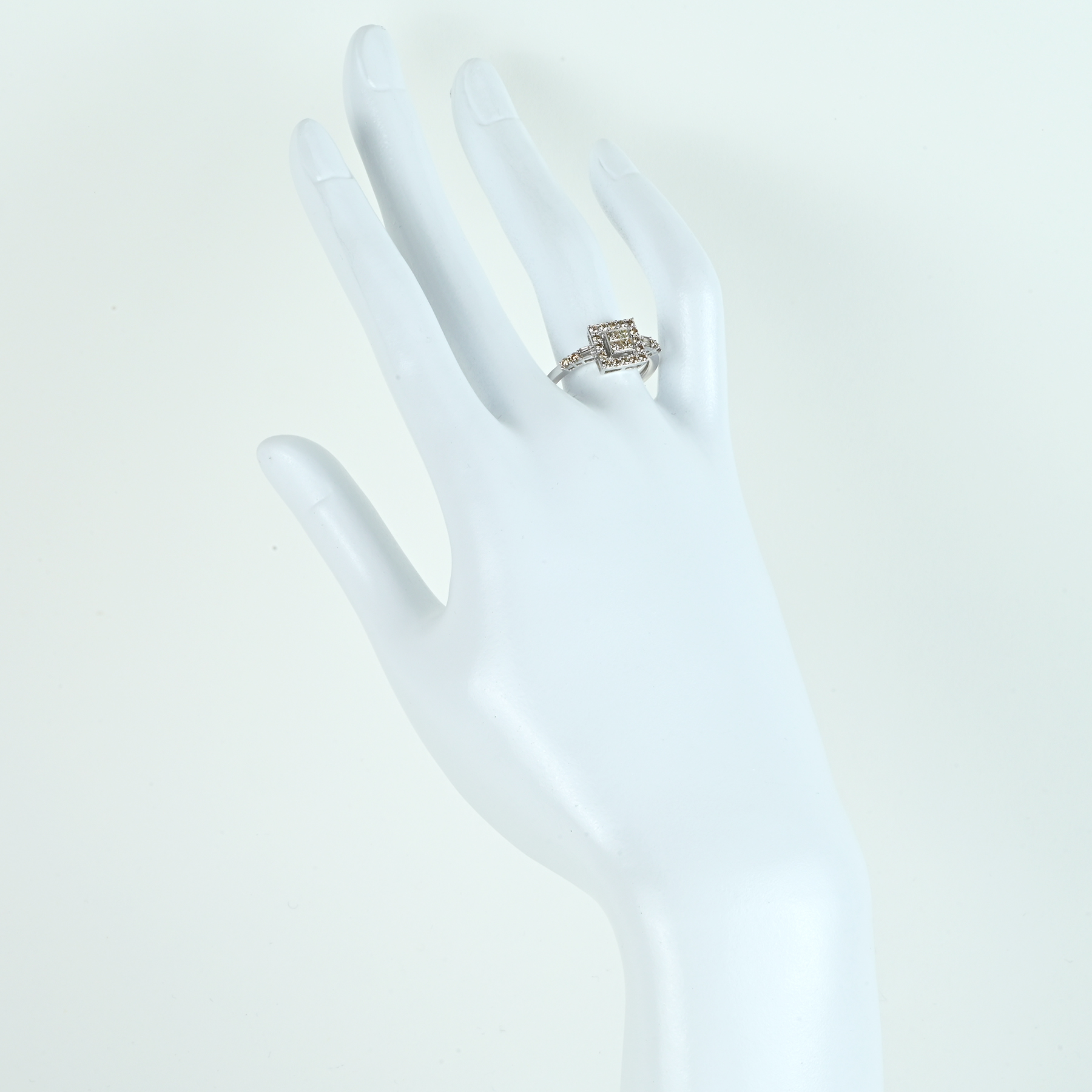 通商産業大臣賞、労働大臣賞など、数々の受賞歴でも世に知られる国際派デザイナー「笠原真寿美」が手がける「レ・エッセンシャル」より、ライトブラウンダイヤモンドをメインに据えたK18WGリング。爪を使用しないインヴィジブルセッティングでプリンセスカットを整え、四石が一体のスクエアを描きながら、光が芯で強く照り返す。取り巻きが粒立つ光を隙なく束ね、造形の格を際立てる一品。