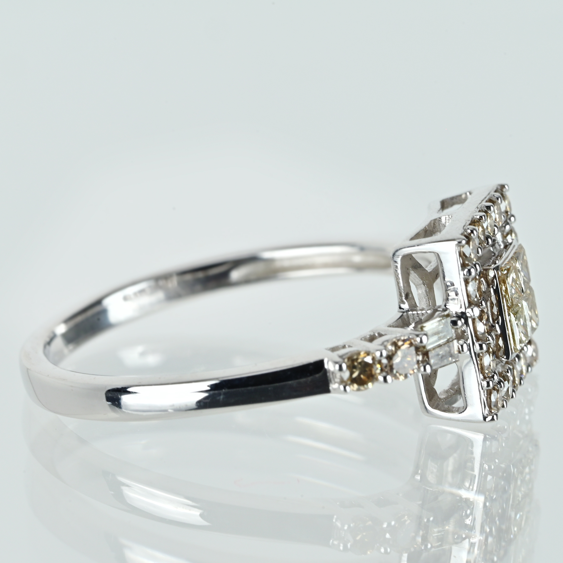 サイドのバゲットとメレダイヤが直線のきらめきを走らせ、華やぎに端正なリズムを添える。ホワイトゴールドの冴えた光沢が輪郭を整え、装いにも洗練のムード。透かしの抜けと総重量3.5gの量感が指元に落ち着き、光の余韻を残す。