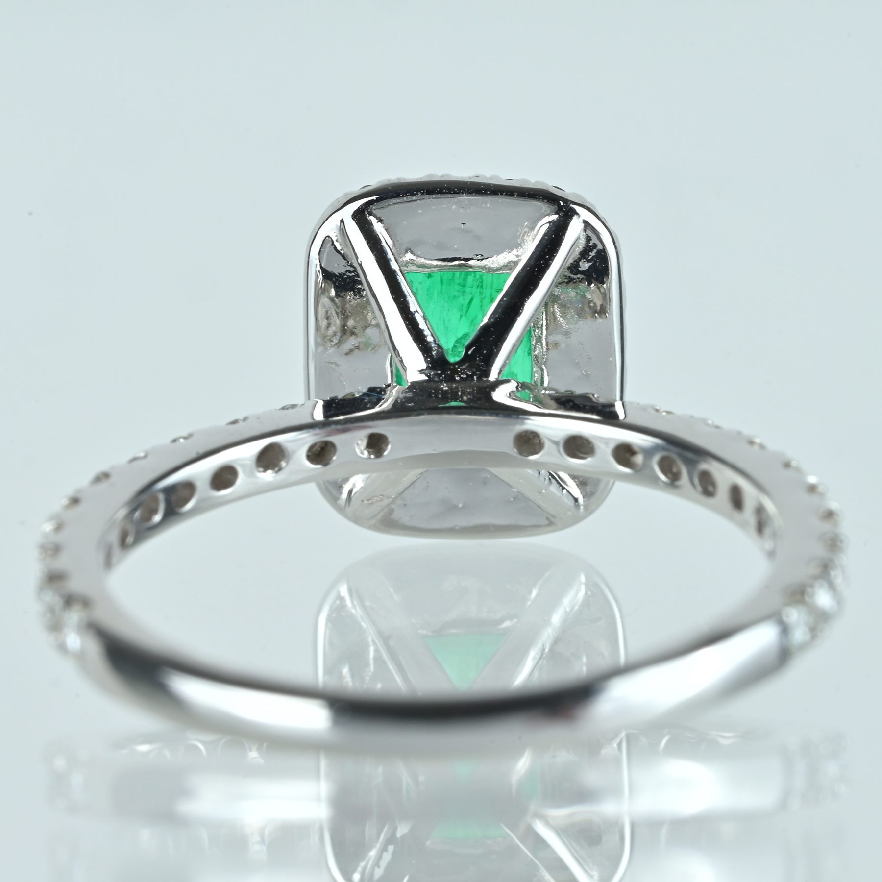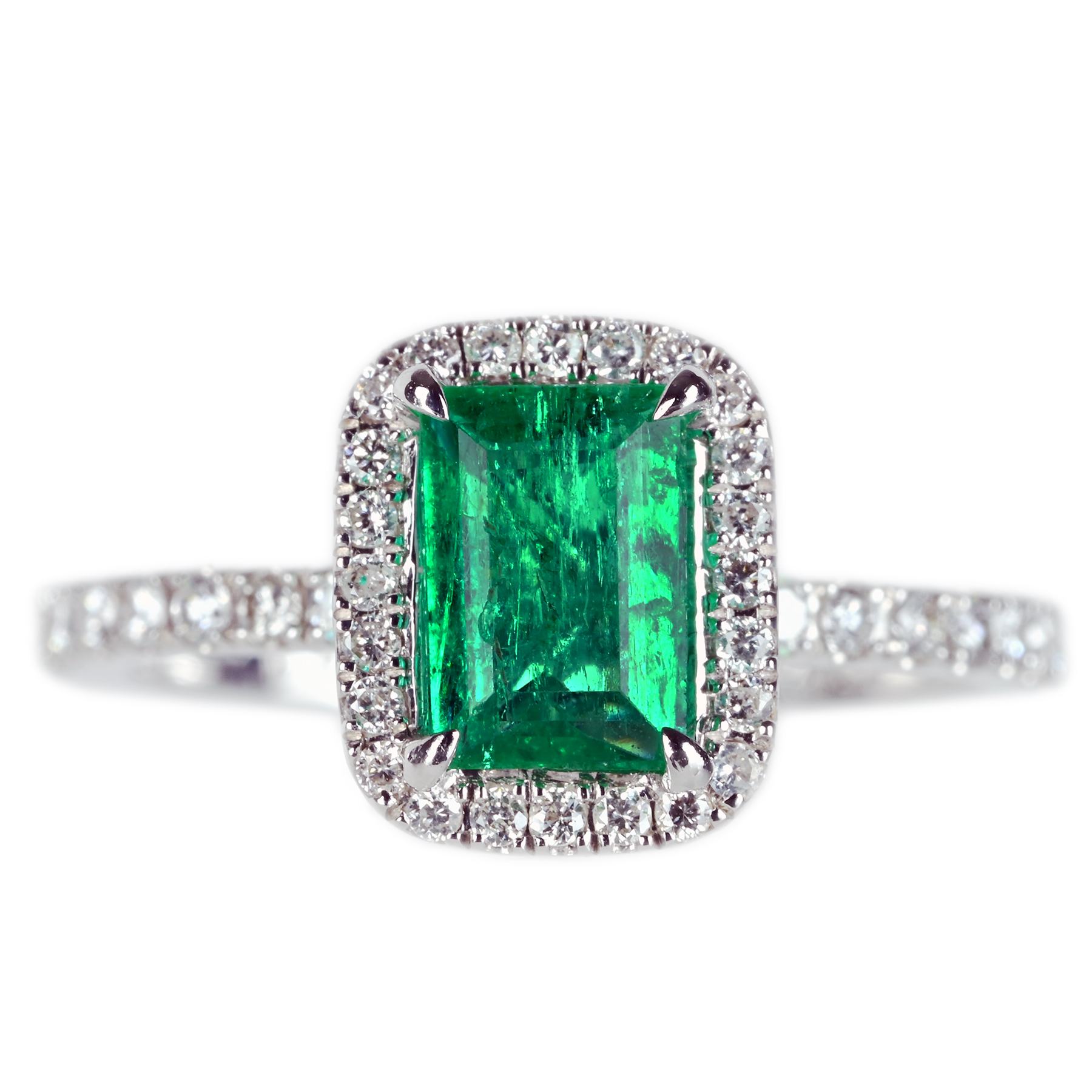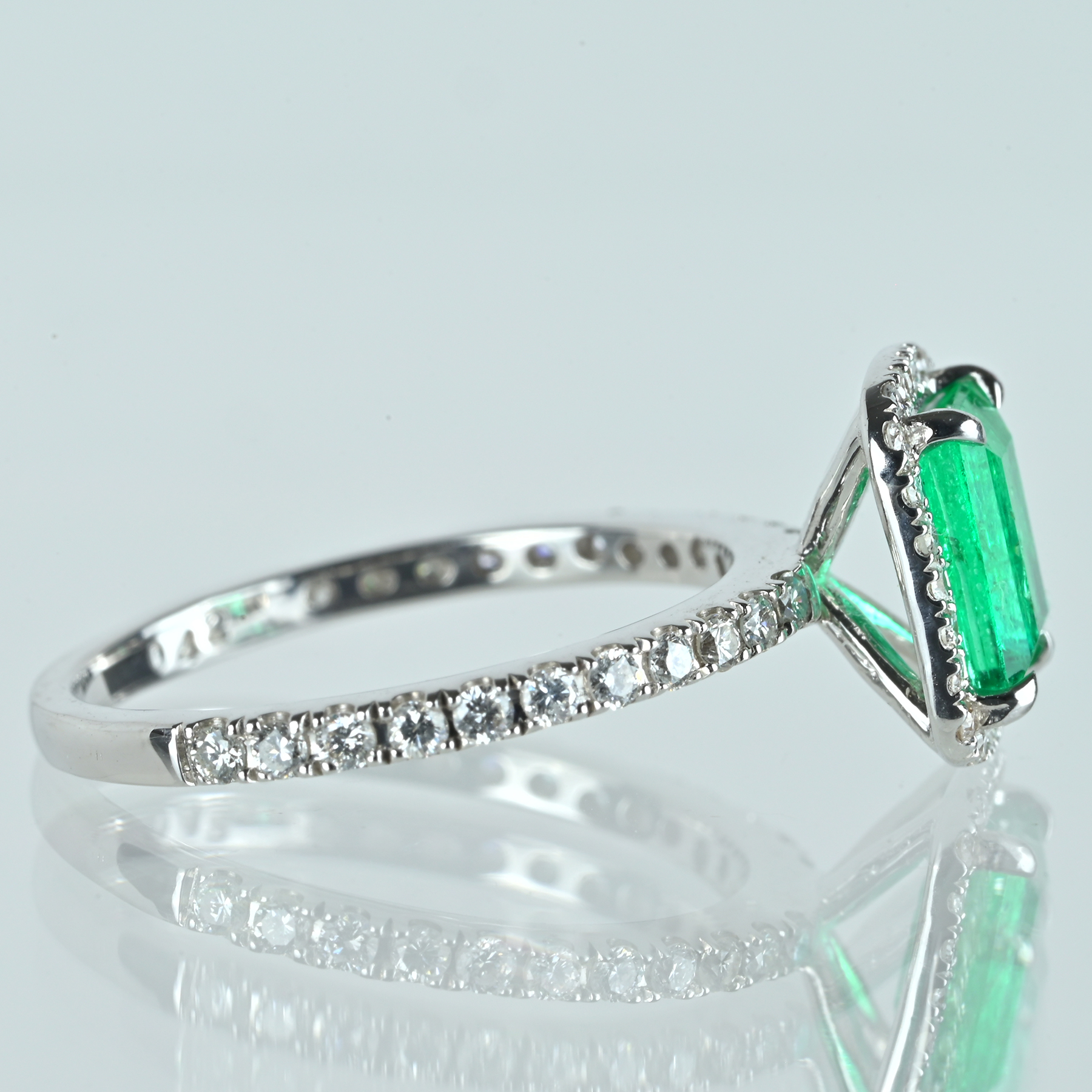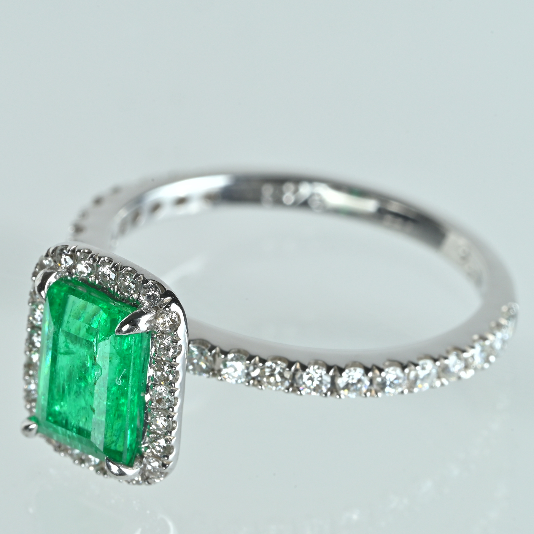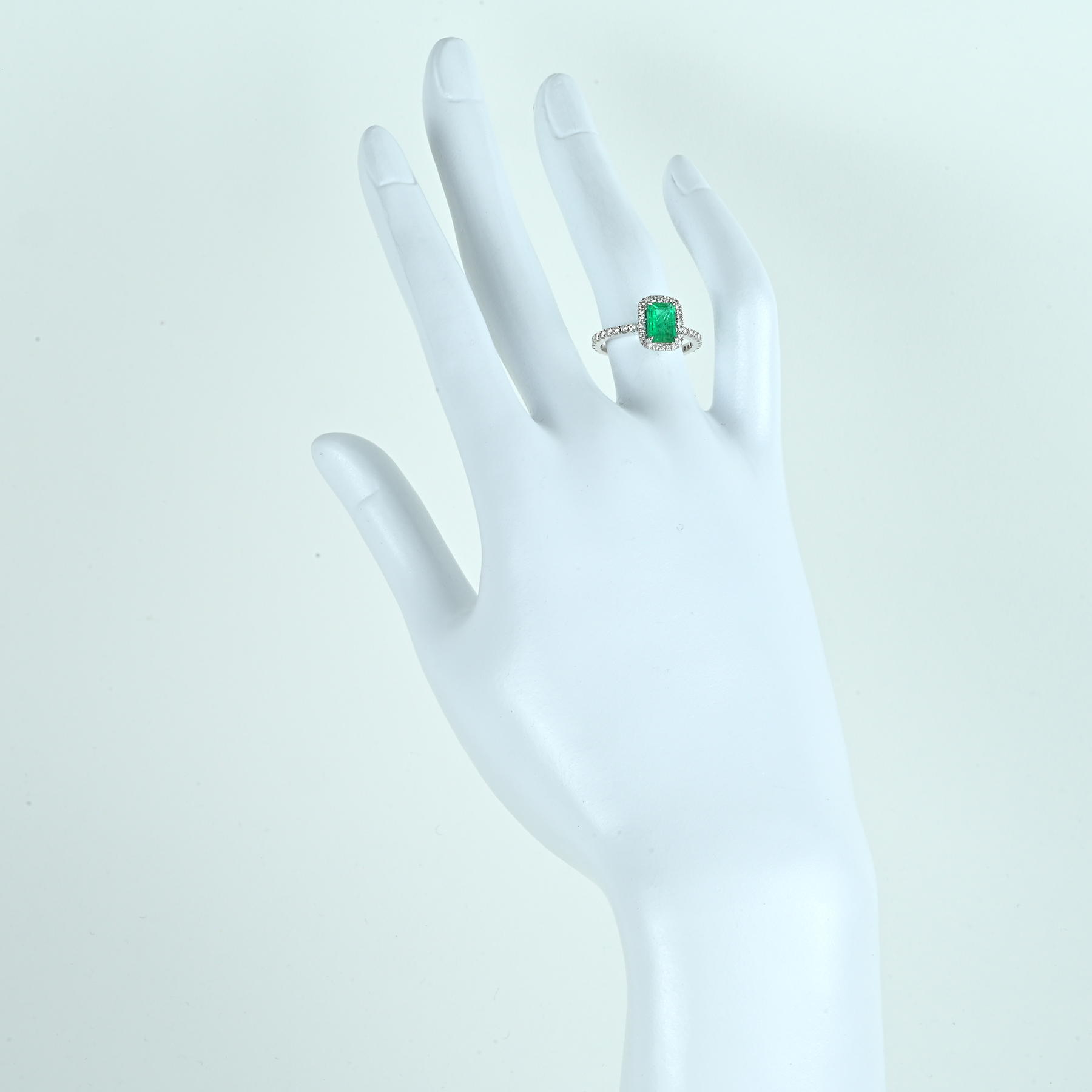 軽やかなグリーンが冴えるエメラルド0.85ctを主役に、ダイヤ0.42ctを添えたK18WGリング。明るさのなかに深みが宿り、透明感とテリの重なりが艶を引き上げる。カット面がきりっと反射し、グリーンの輪郭を清潔に描く一品。