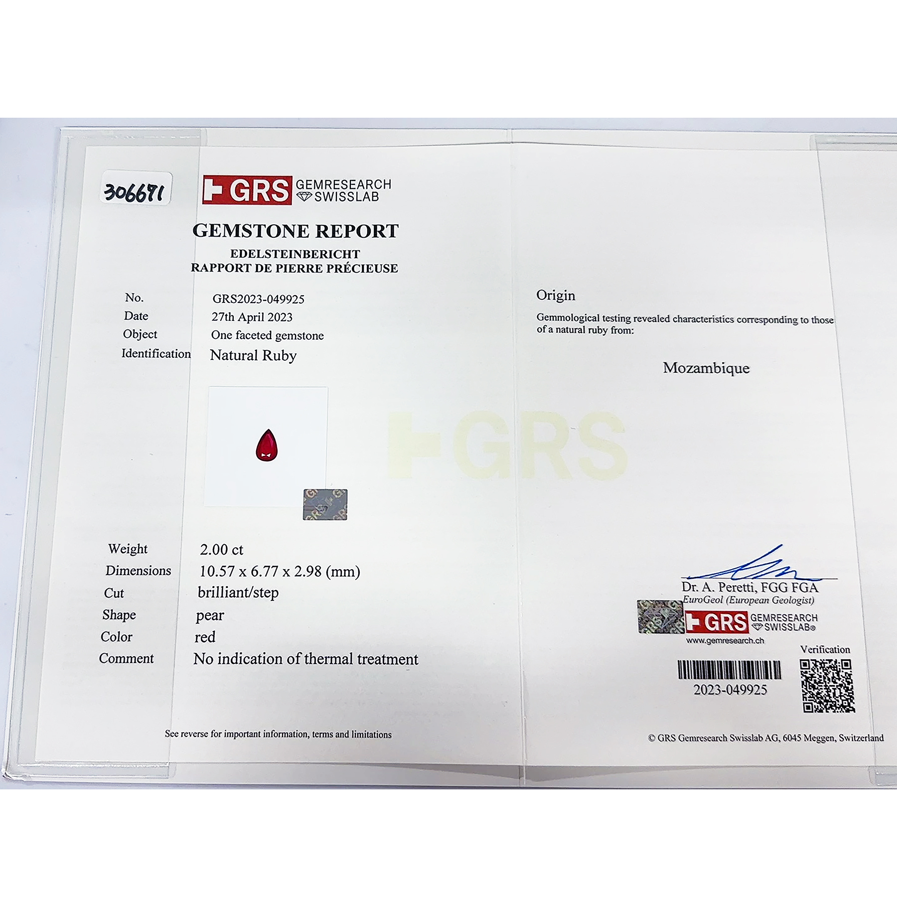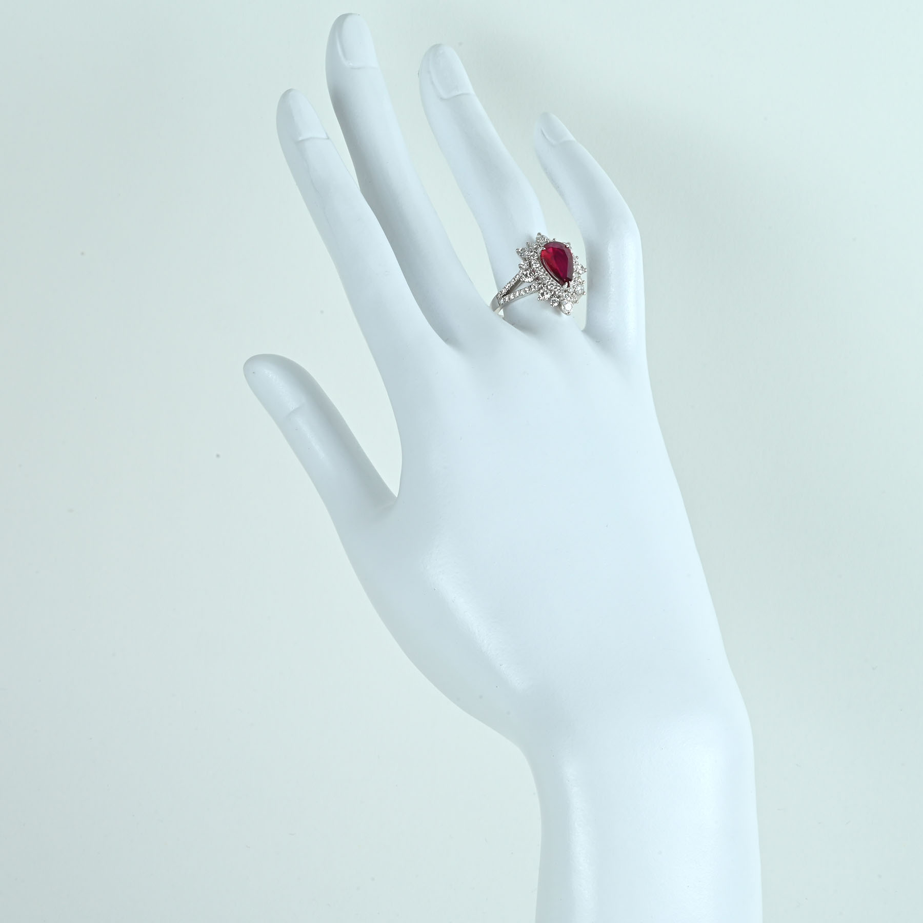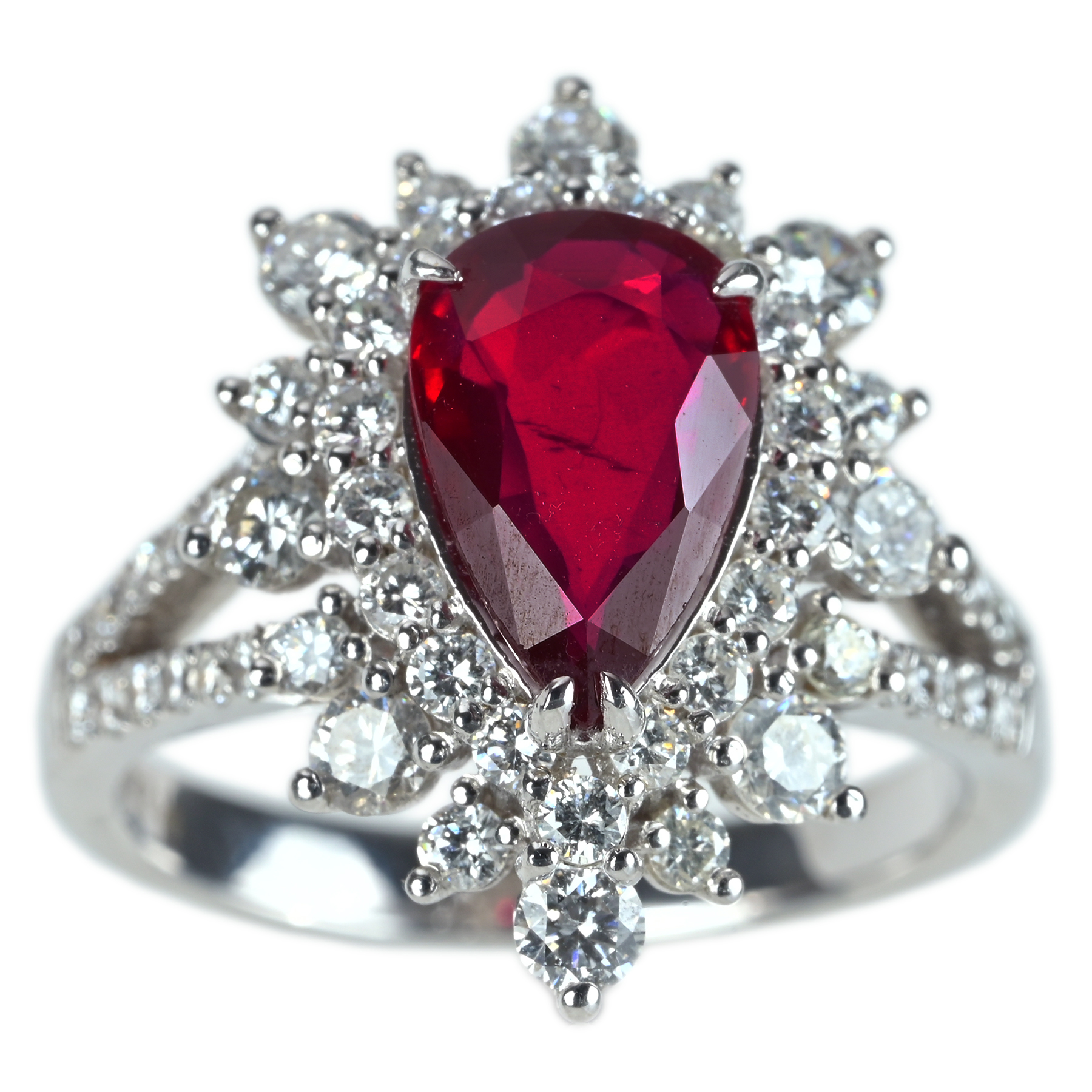 深く鮮やかなレッドが芯まで満ちるモザンビーク産非加熱ルビー2.00ctを主役に、ダイヤモンド1.26ctを添えたK18WGリング。肉眼でも捉えられる天然由来のインクルージョン透明感の揺れが赤の層へ陰影を添え、テリが奥から美しく返る。ペアシェイプの均整が指元へ視線を集め、ブリリアントとステップのファセットが艶と輪郭の冴えを両立。濃密な赤と整ったシルエットが同居する一品。