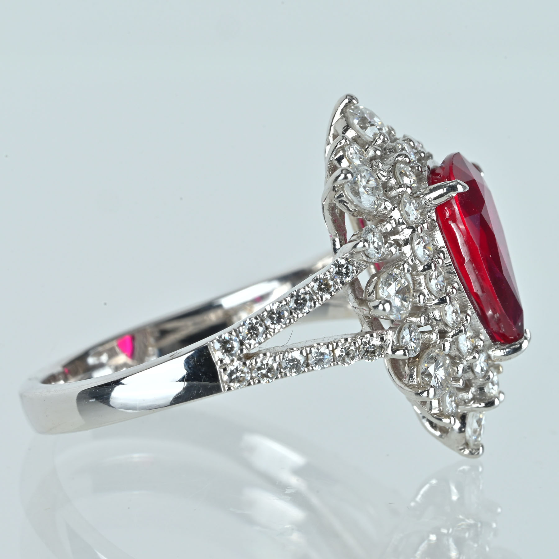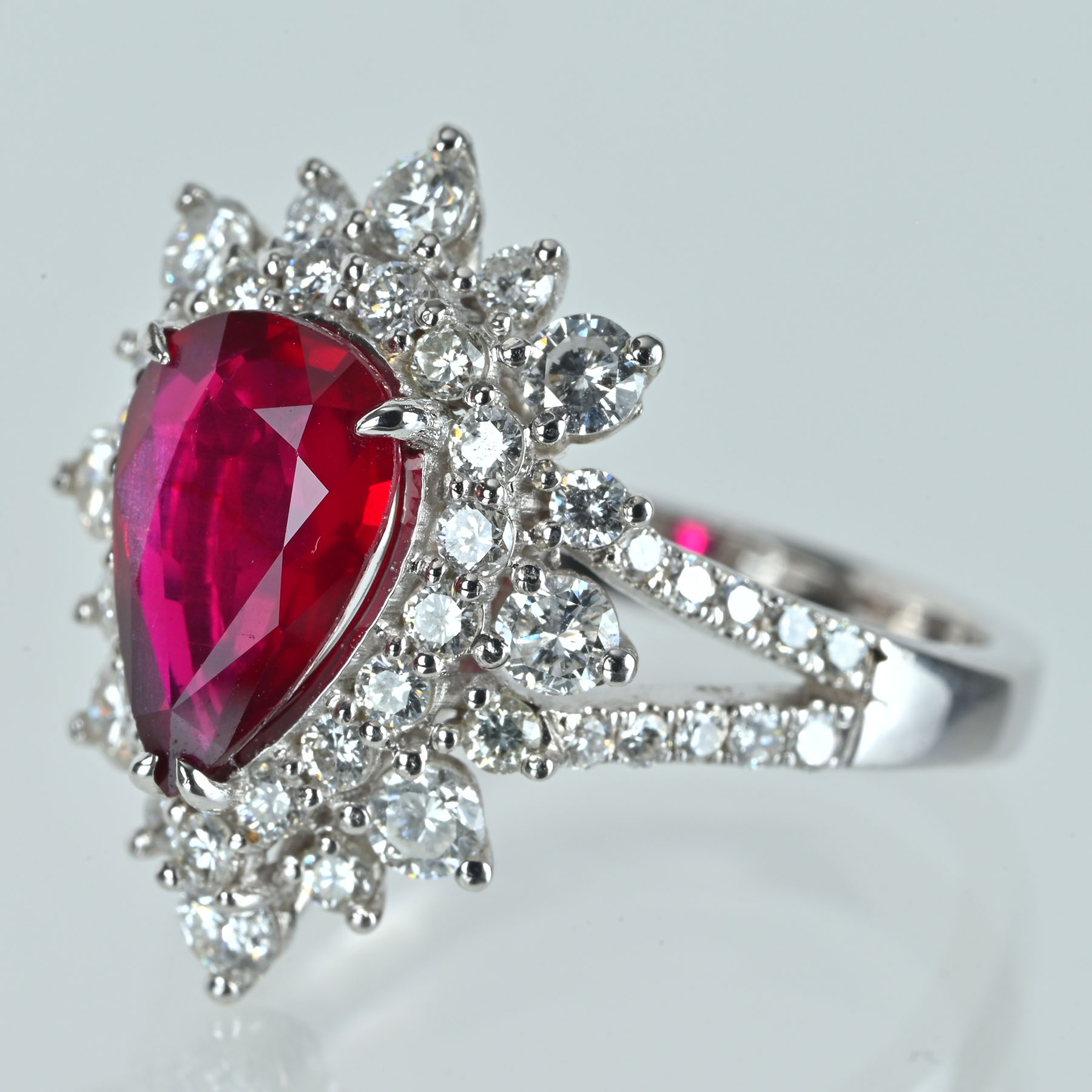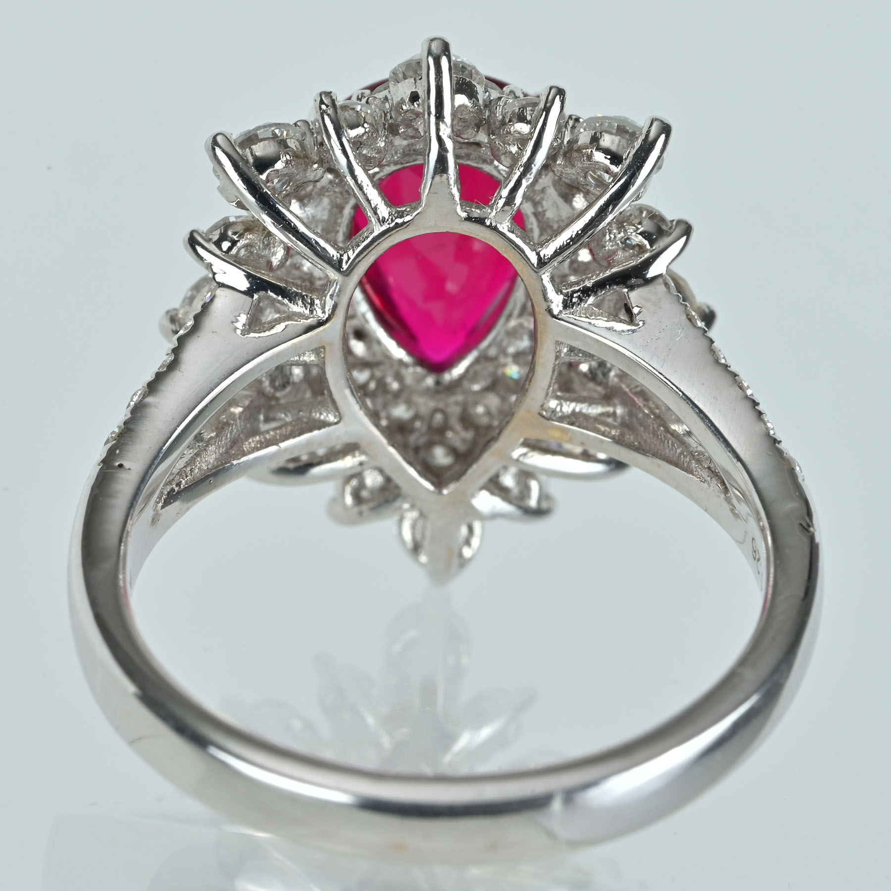 深く鮮やかなレッドが芯まで満ちるモザンビーク産非加熱ルビー2.00ctを主役に、ダイヤモンド1.26ctを添えたK18WGリング。肉眼でも捉えられる天然由来のインクルージョン透明感の揺れが赤の層へ陰影を添え、テリが奥から美しく返る。ペアシェイプの均整が指元へ視線を集め、ブリリアントとステップのファセットが艶と輪郭の冴えを両立。濃密な赤と整ったシルエットが同居する一品。