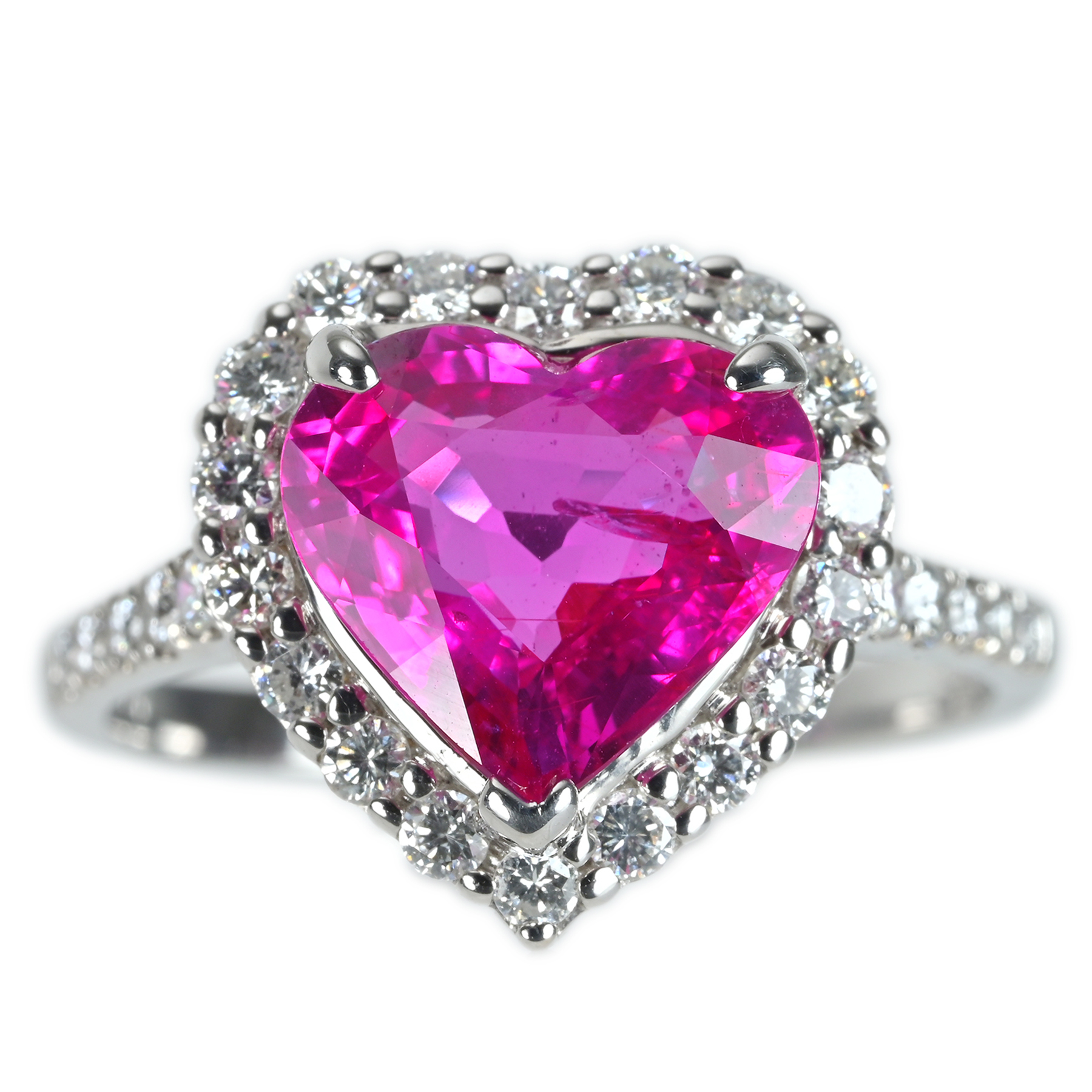鮮やかなビビッドピンクが芯まで際立つ非加熱ピンクサファイア3.11ctを主役に、ダイヤモンド0.50ctを添えたK18WGリング。奥から照り返る艶が赤みを含むピンクをいっそう澄み渡らせ、肉眼では内包物の影は捉えにくい透明感。取り巻く飾りダイヤが輪郭の輝きを細く丁寧に揃え、ハートのモチーフへ光を集める。バランスの整うシェイプが視線を中心へ導き、色彩の強さを端正にまとめる一品。