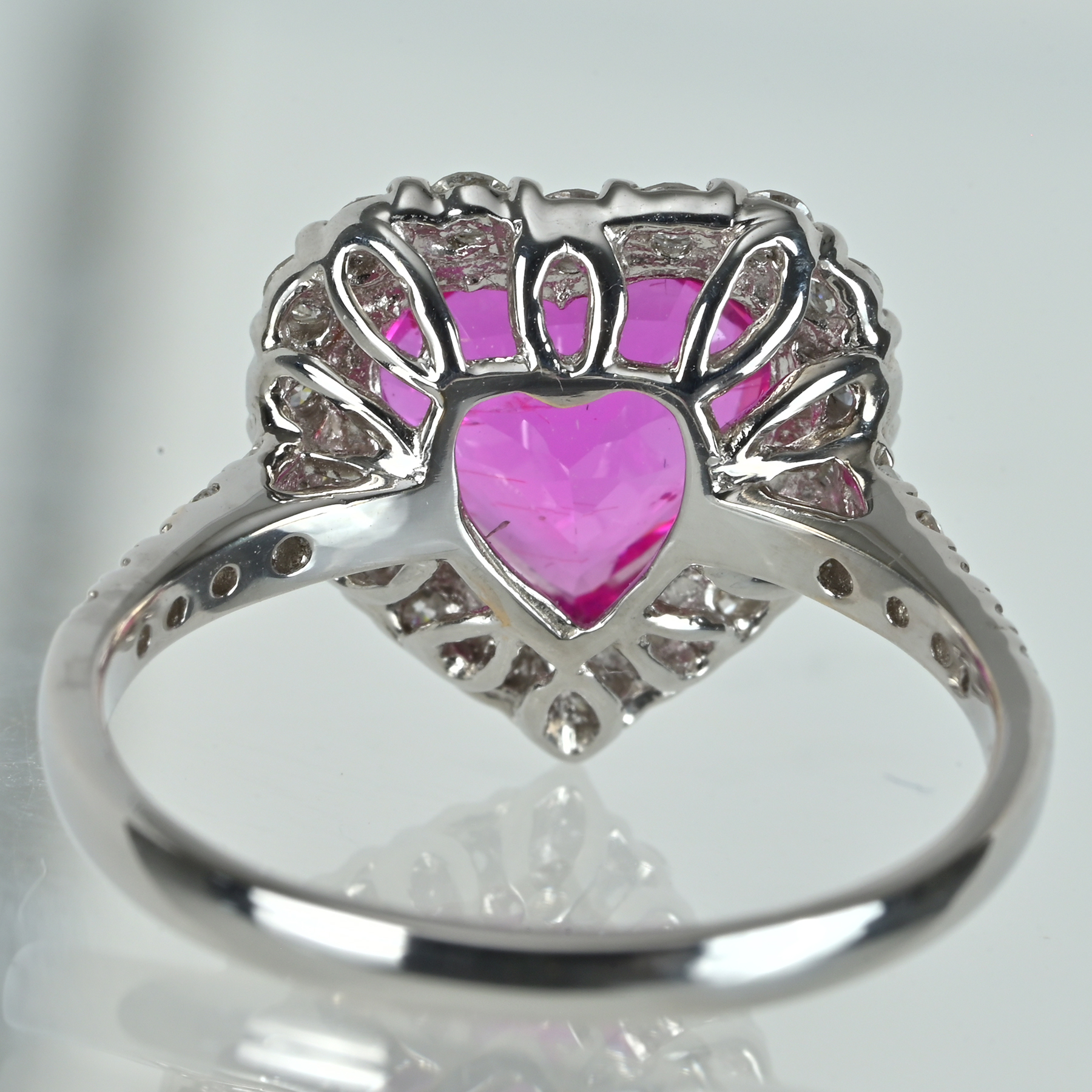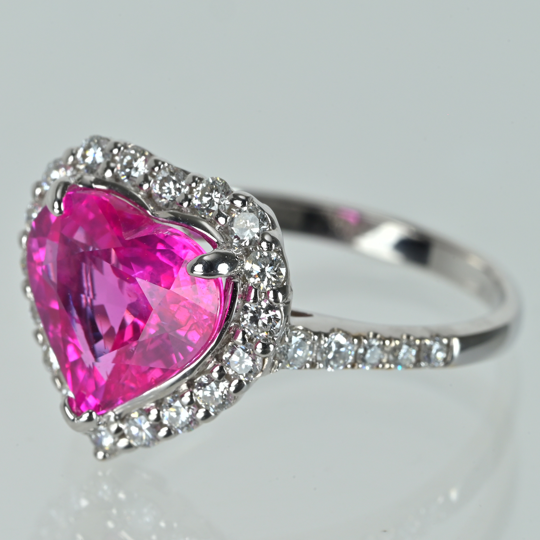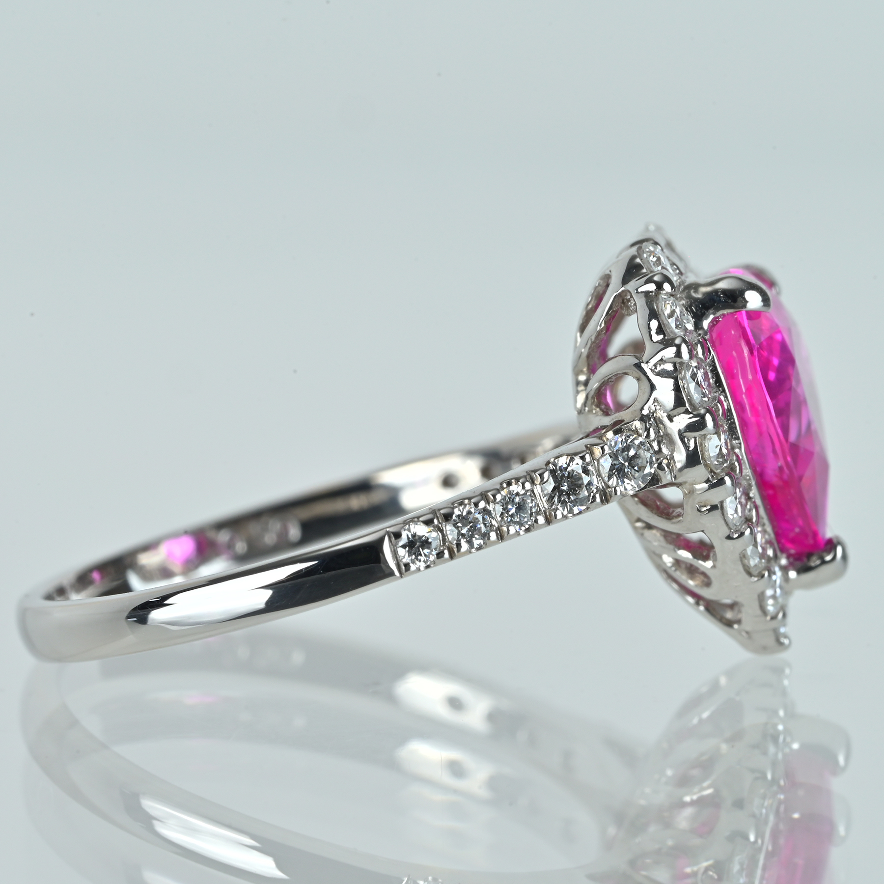 ヘイローと肩のパヴェが無色域の輝きを細かく繋ぎ、中心の色彩へ光彩を押し戻す。爪の高さを抑えた石座がハートの輪郭を整え、横顔の透かしが軽さと立体を生む意匠。ファセットの切り込みが艶の筋を鋭く立て、濃さと明るさを同時に引き上げている。