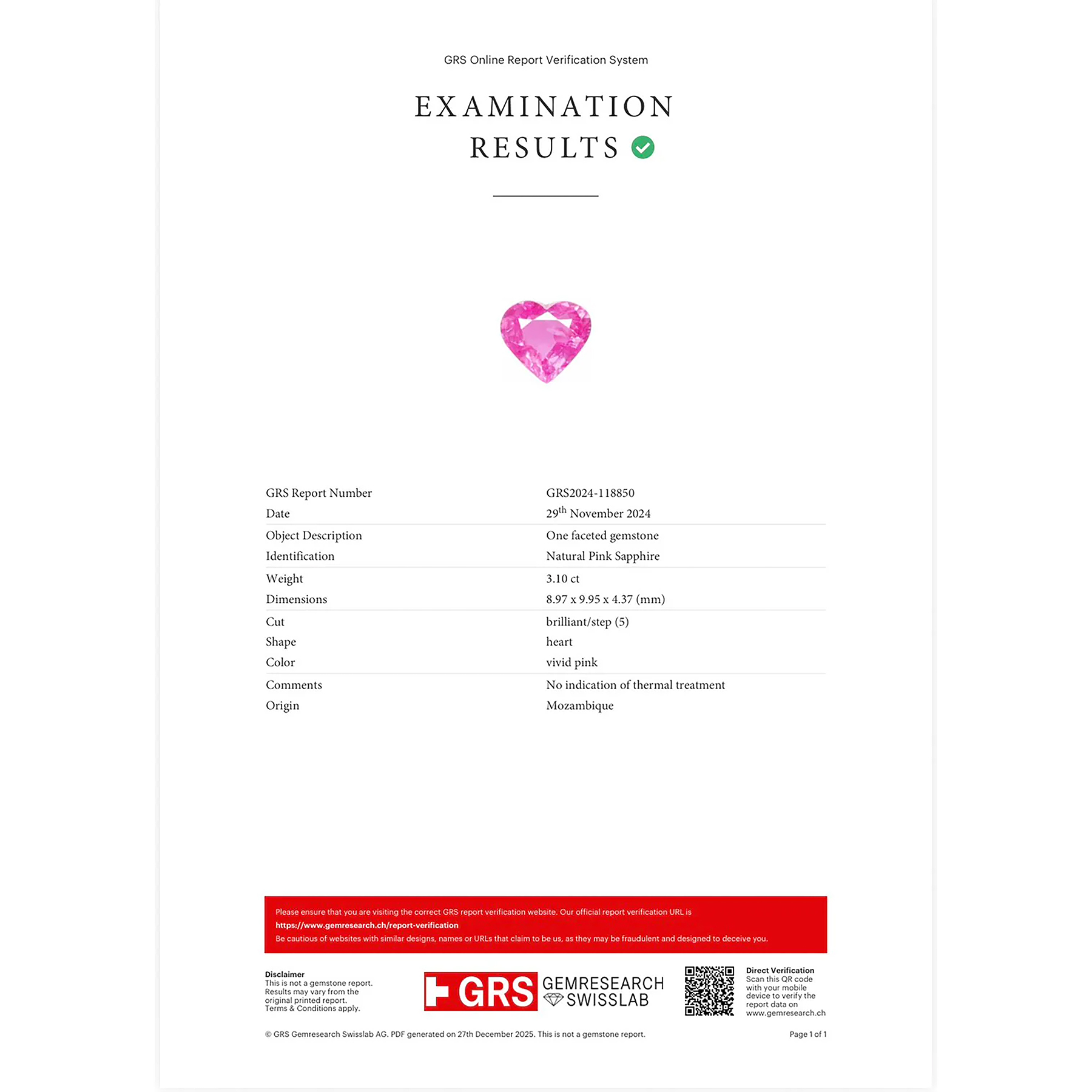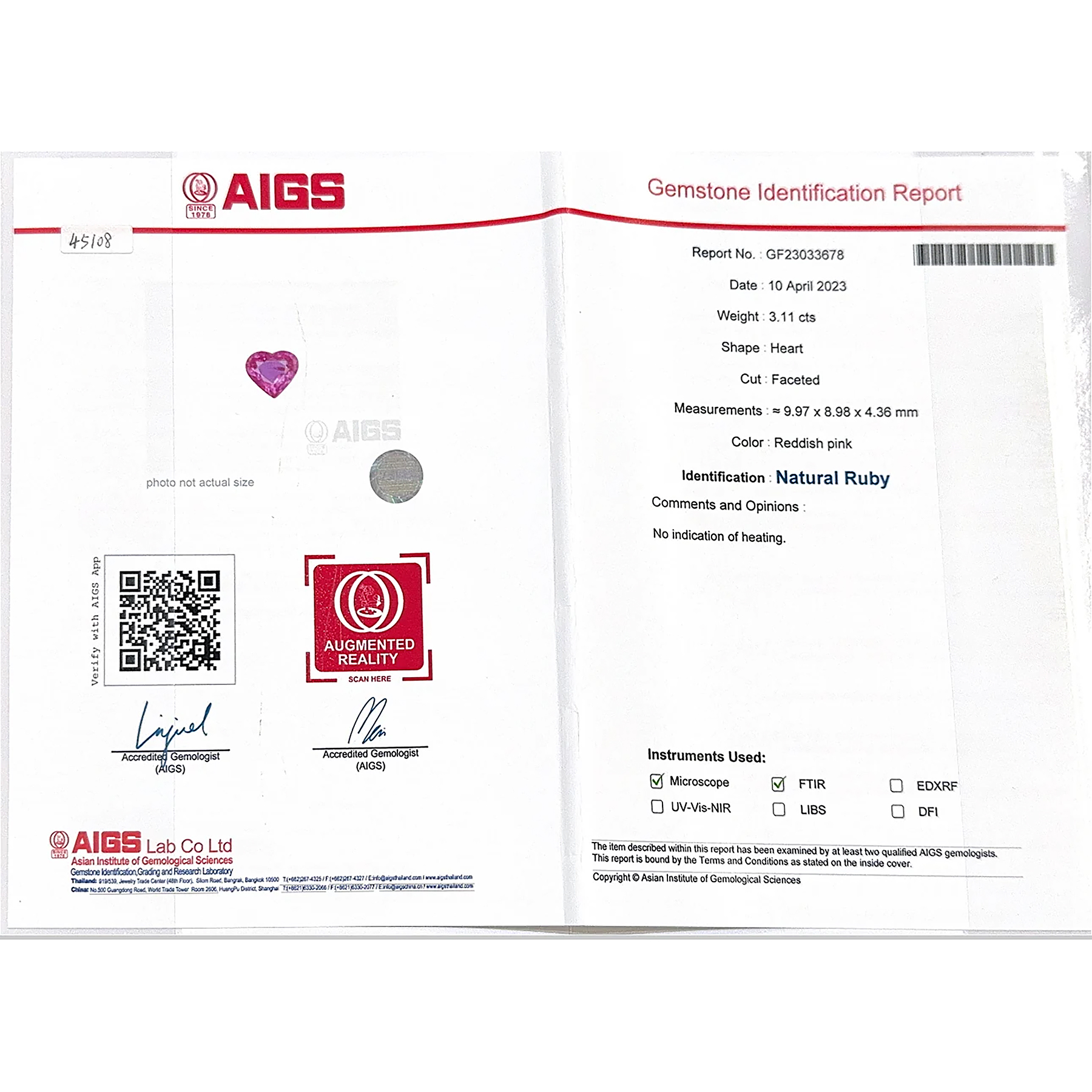 ルビーとサファイアは、どちらも同一の「コランダム」という鉱物。赤色のものはルビー。赤色以外のものをサファイアと呼ぶ。本石は赤みが濃く入るピンク。AIGSでは「Natural Ruby」として記載されている。呼び名が揺れる色域に跨ることで、甘さだけに寄らない緊張がハートの可憐さへ重なる。