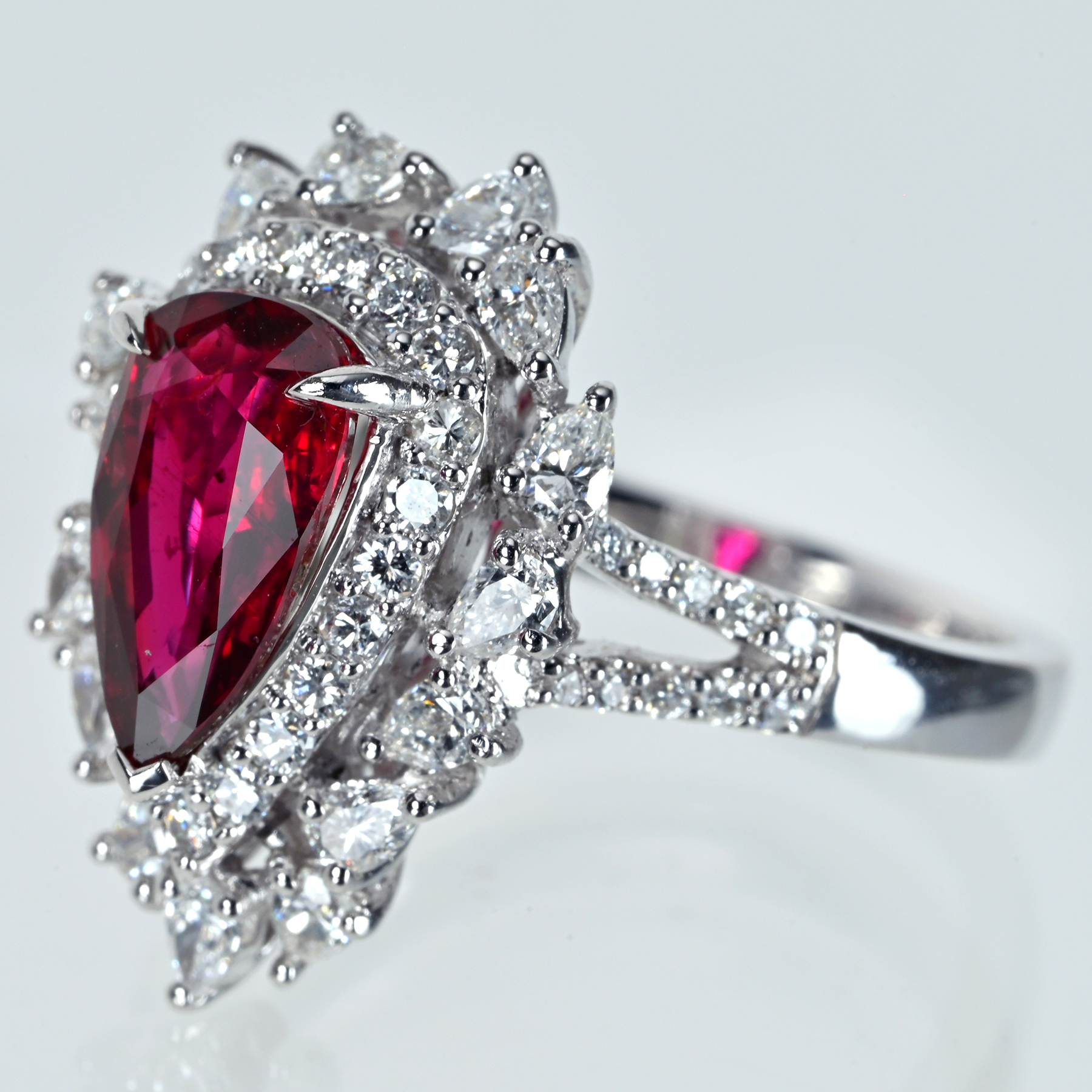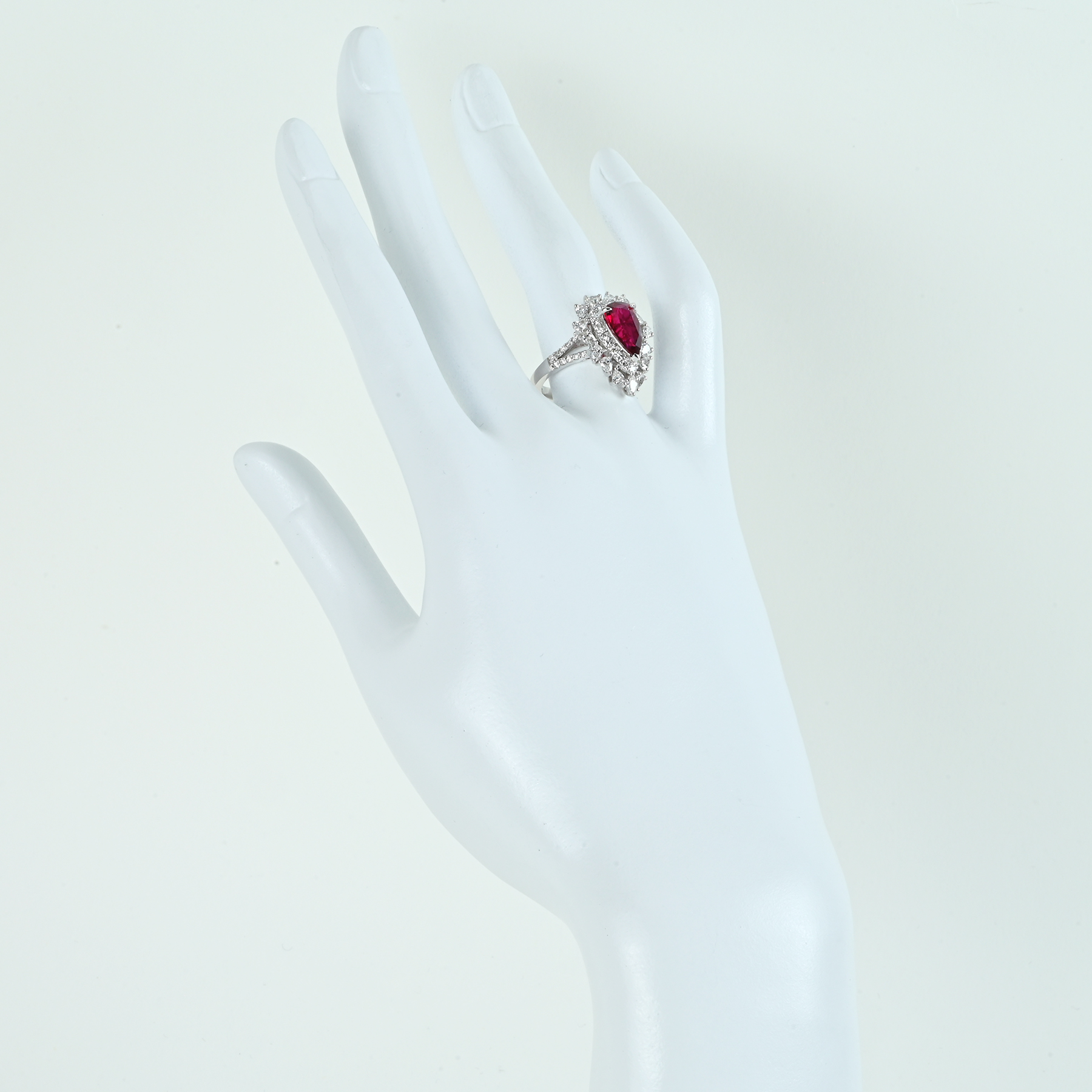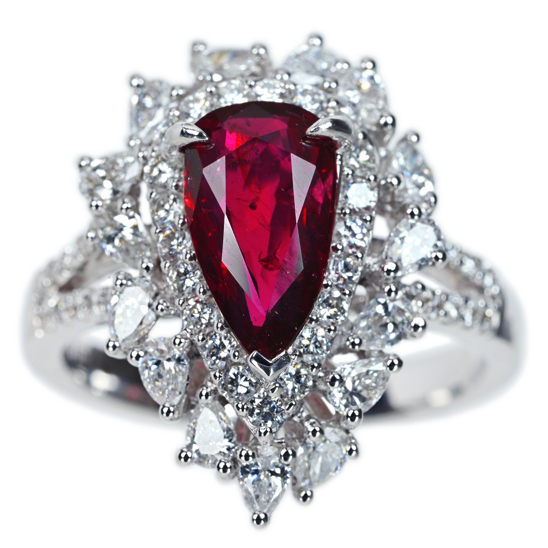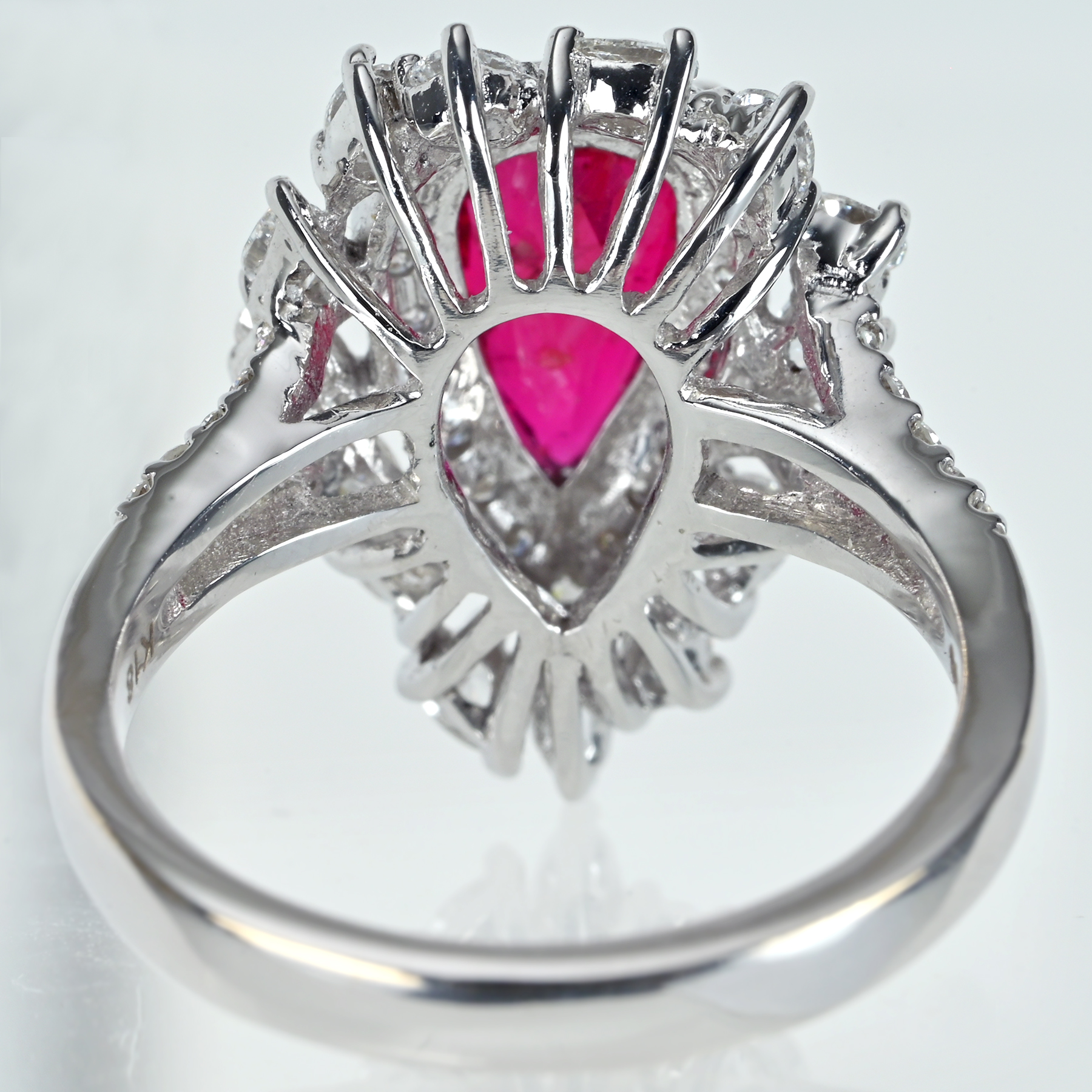 深いレッドが濃密に際立つモザンビーク産非加熱ルビー2.01ctをメインに、ダイヤモンド1.08ctを添えたK18WGリング。深紅の芯に透明感を帯び、テリが石の奥で強く跳ね返り視線を離さない。メレダイヤとペアシェイプダイヤが二重のシルエットを映し、雫形に調和された華やかな一品。