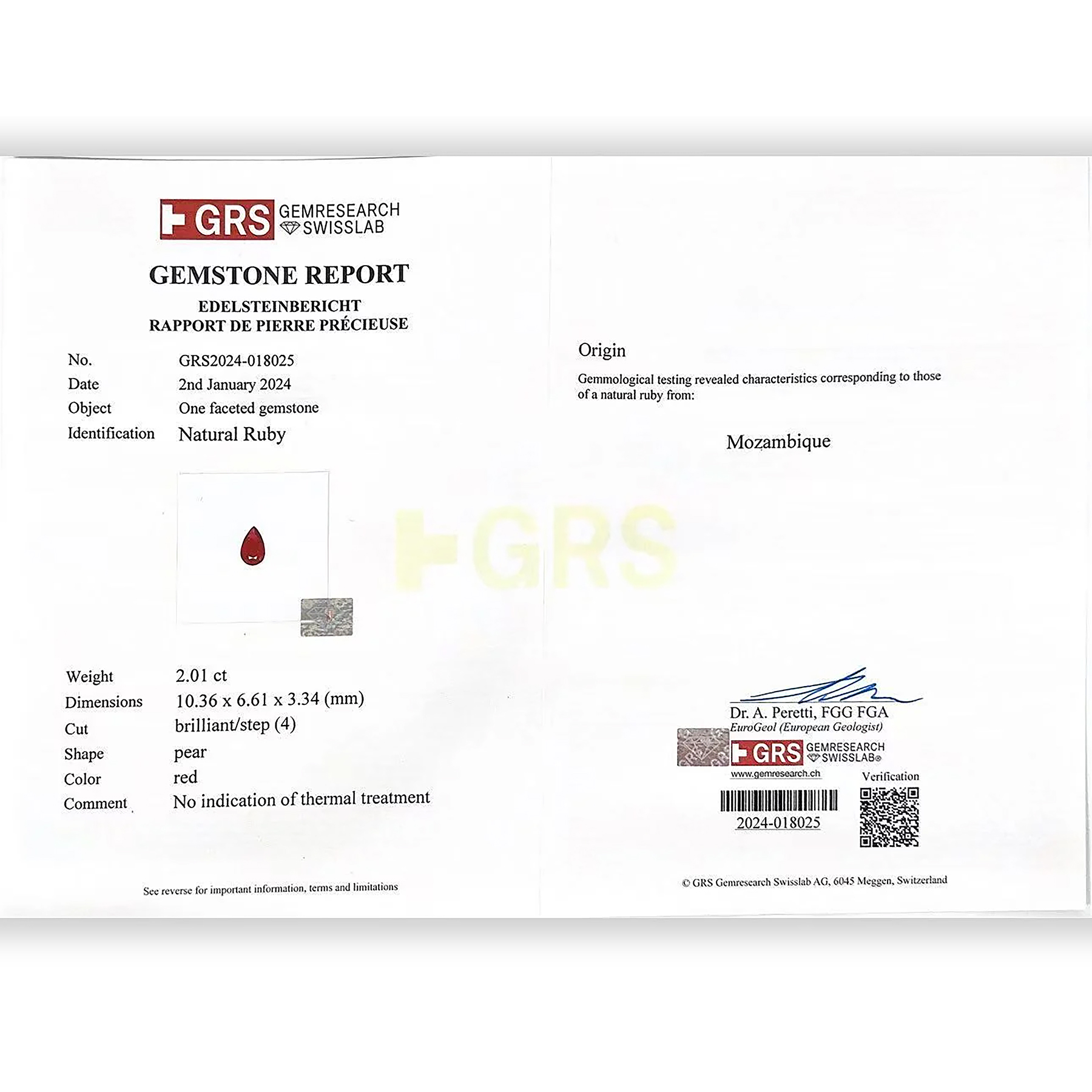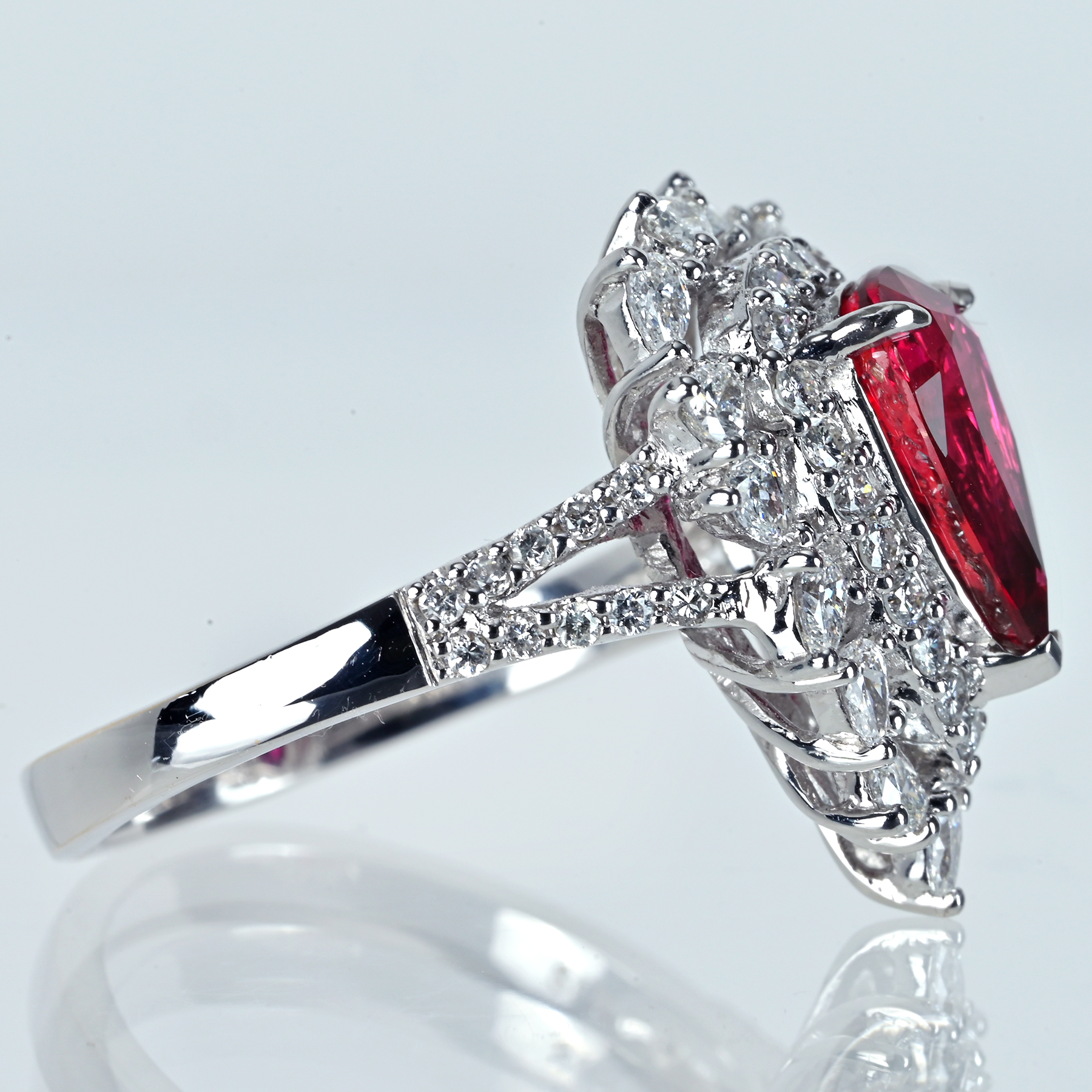 GRS鑑別書の「非加熱」表記が、加熱処理に寄らない発色と艶の張りを支える根拠。角度に応じて澄みわたる赤と濃密な赤が折り重なる様は、モザンビークらしさを物語る。取り巻きのダイヤが光を細かく受け渡し、センターの色彩を拡張。ペアシェイプダイヤのシャープさが輪郭を締め、メレダイヤの粒立ちが光彩の密度を高めている。