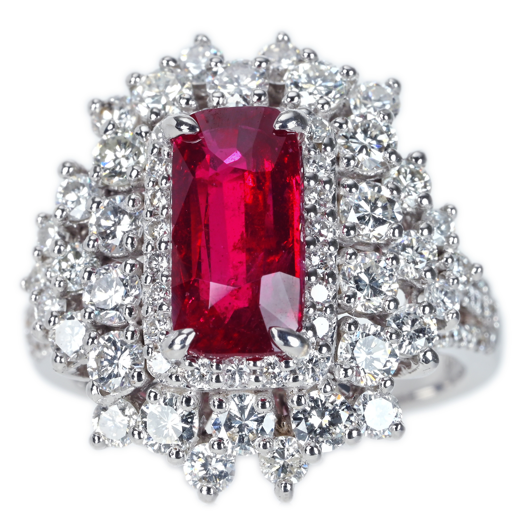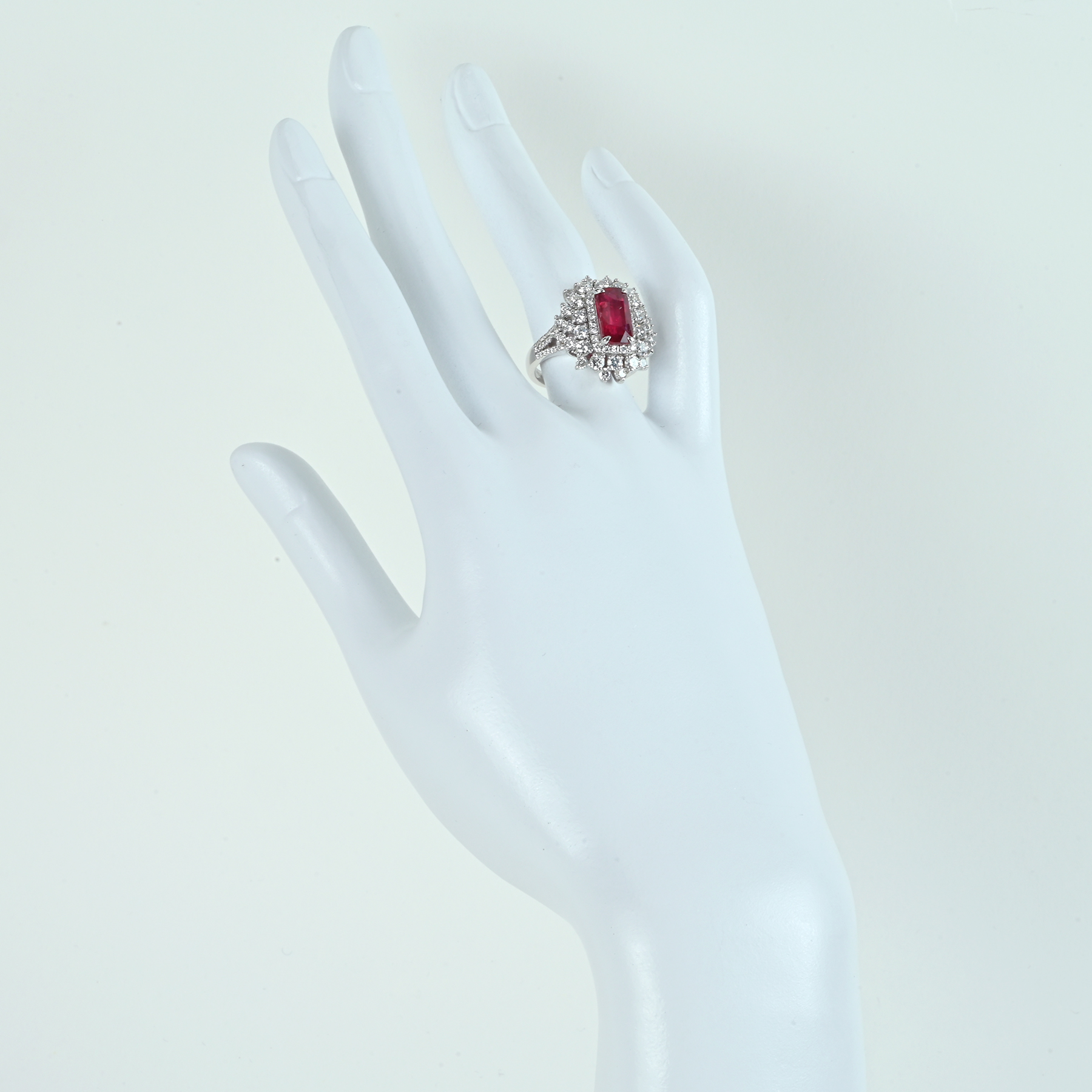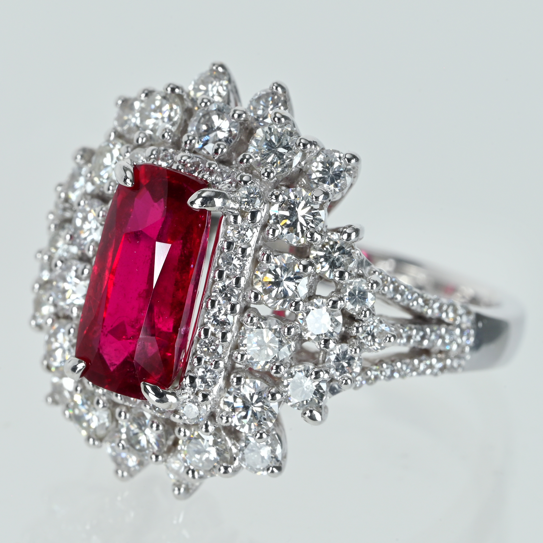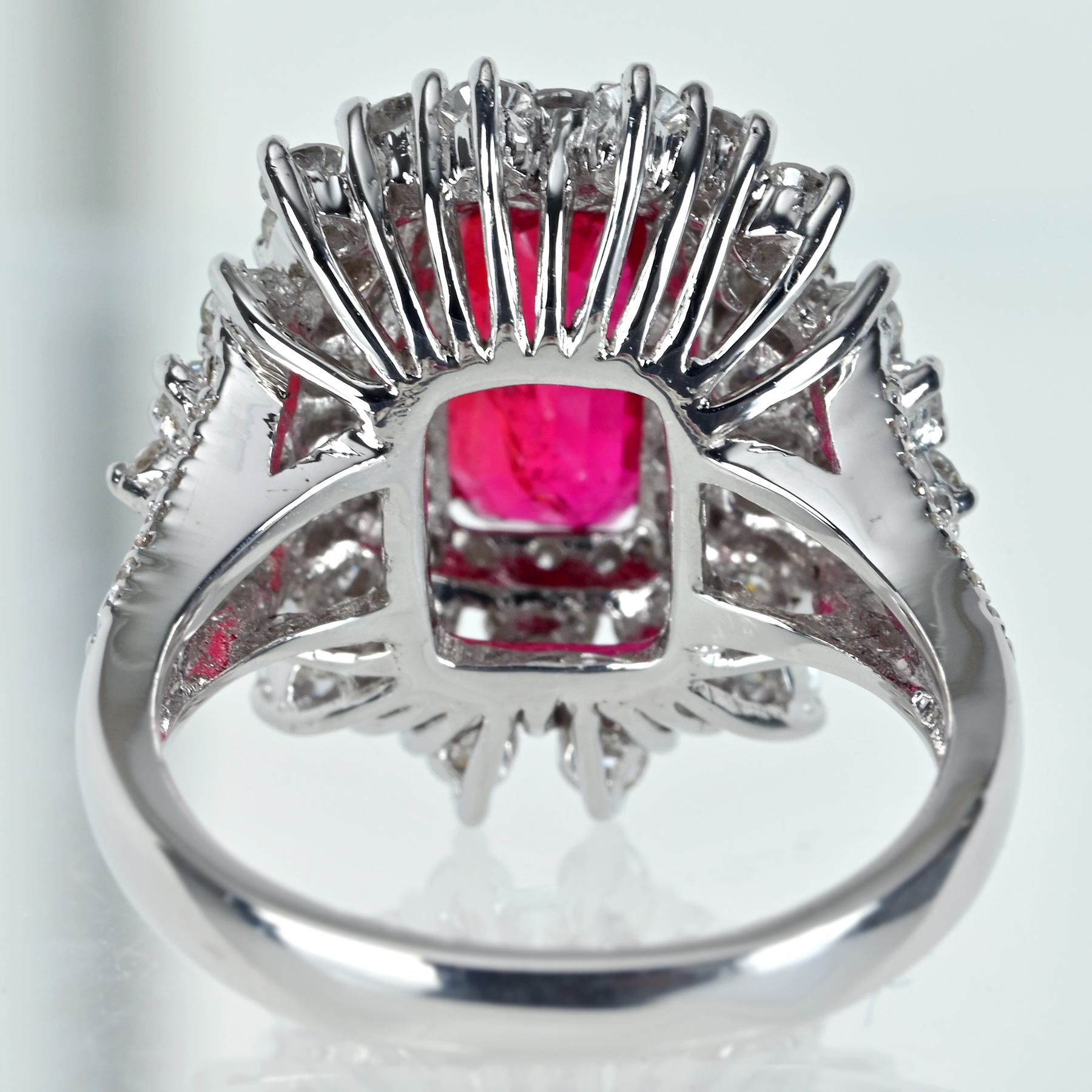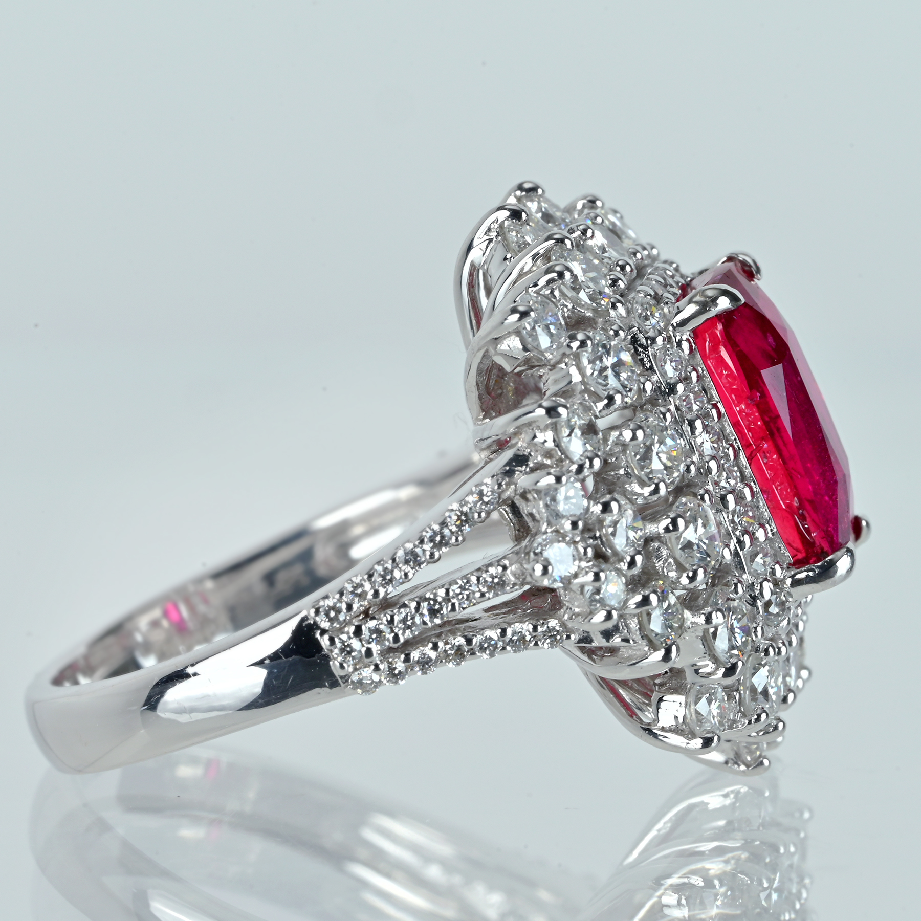 外周へ隙間なく広がるダイヤが無色域の澄んだ輝きを束ね、トップの赤を立体的に演出。粒立ちの良いラウンドが光を導きながら連なり、二重の取り巻きが花弁のように揺らぐ。サイドのクラスターと肩のメレダイヤが光の道筋を作り、華やぎにコントラストを形成。爪の主張を抑えた丁寧な細工が石の輪郭を崩さず、量感を静かな格調に仕立てている。