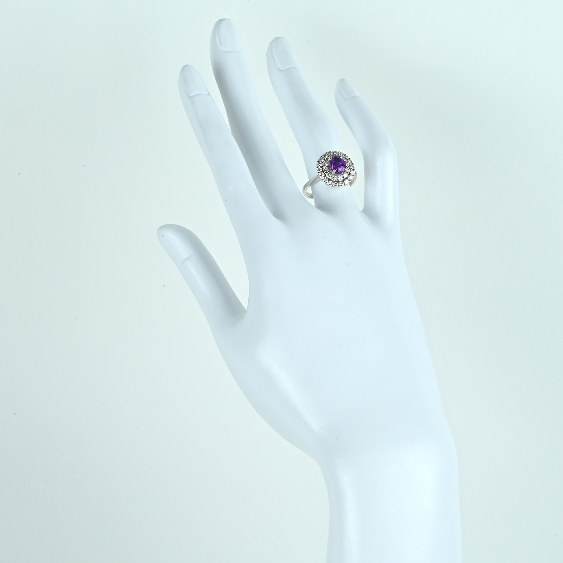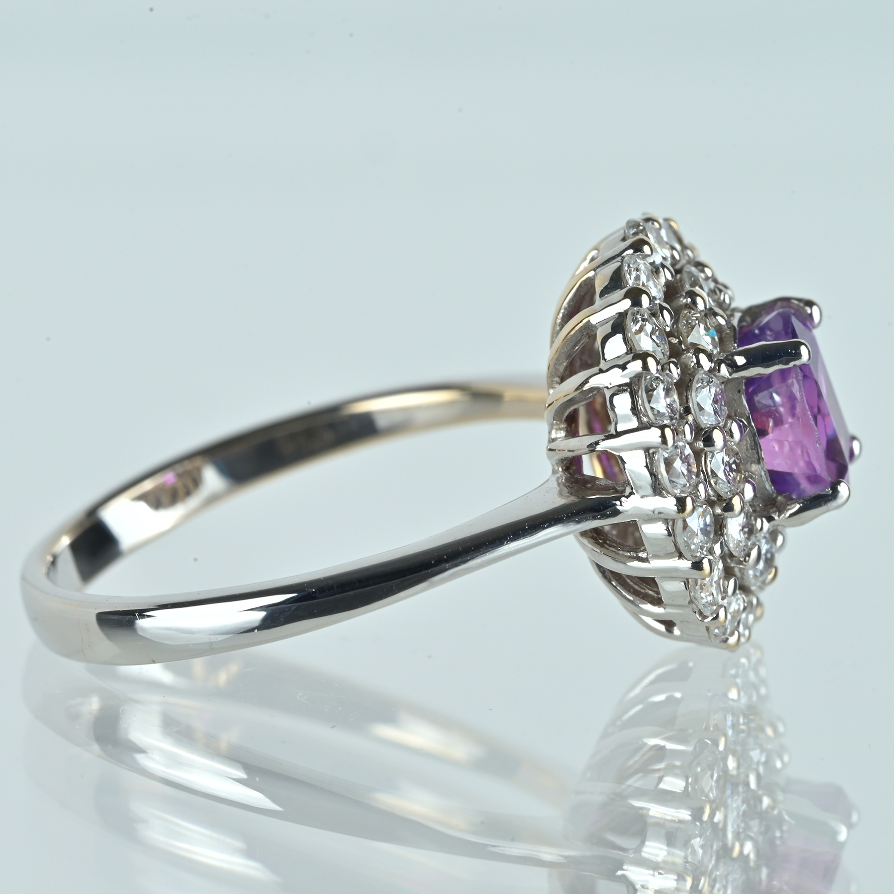 鮮やかなパープルが印象的なサファイア1.428ctをセンターに据えたK18WGリング。 オーバルシェイプのカット面が光を切り取り、角度によってピンク味を帯びた輝きがふっと顔を出す。色の主張と透明感のあるテリが同居し、凛とした華やぎを宿す一品。