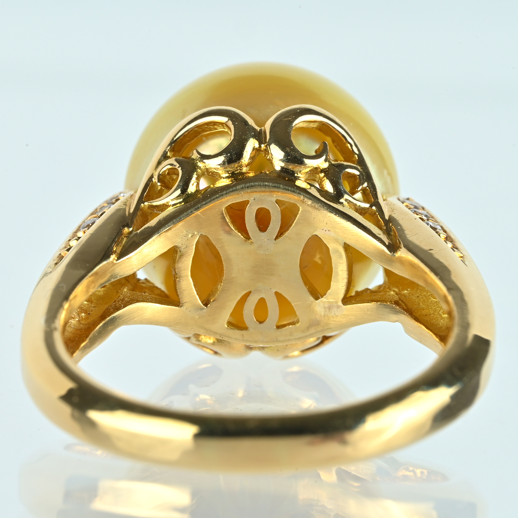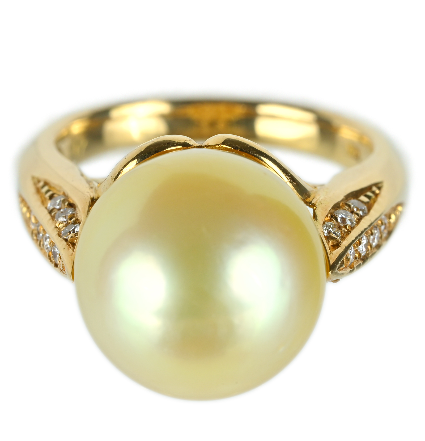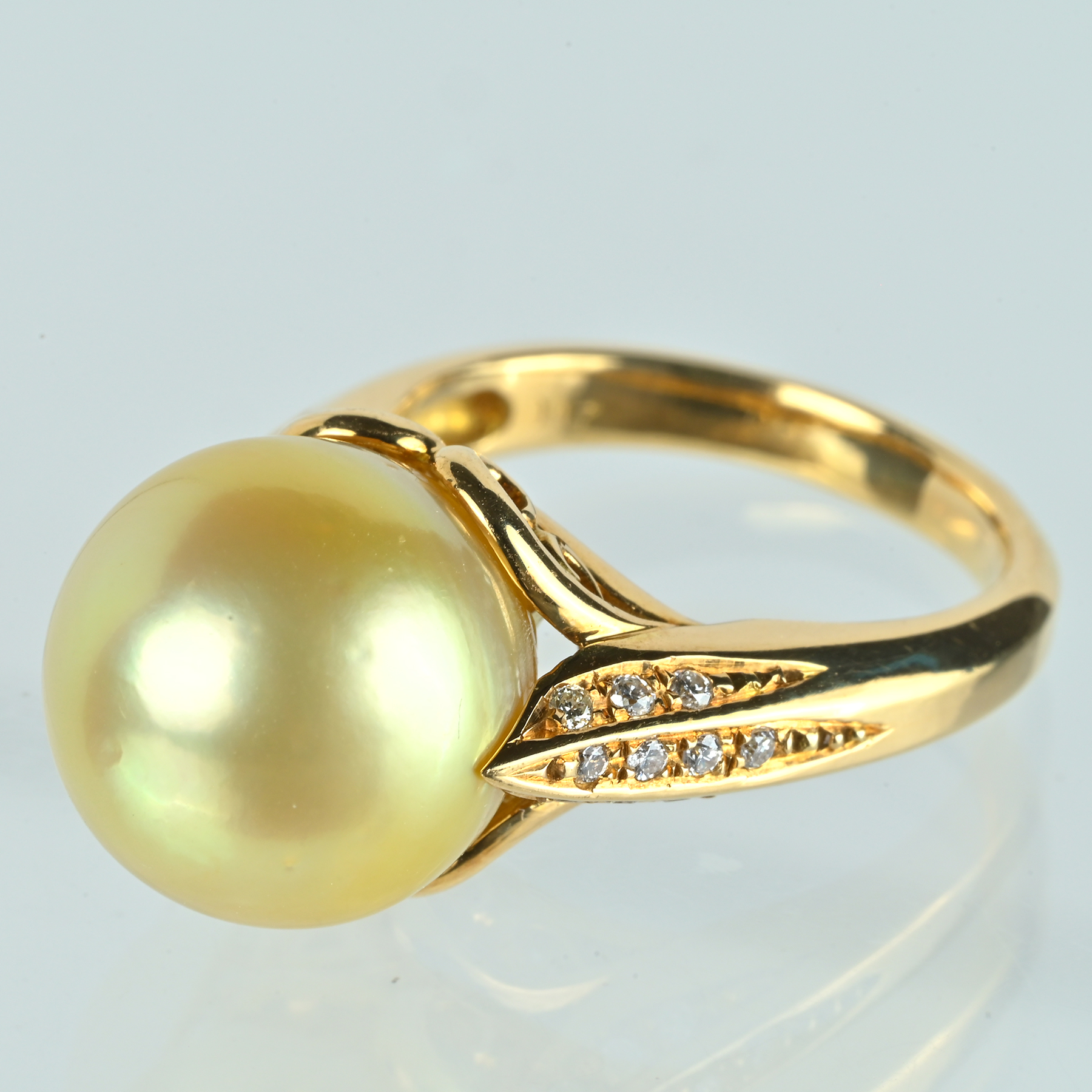 シャンパンゴールドのような13.1mmのゴールデンパールをメインに、ダイヤ0.17ctを両肩に連ね、横顔まで華やかなK18YGリング。淡い金色のテリが球面に満ち、柔らかな光をすっと返す一品。ショルダーに二列で並ぶメレダイヤが細い光の筋を走らせ、輝きの輪郭を浮かび上がらせる。