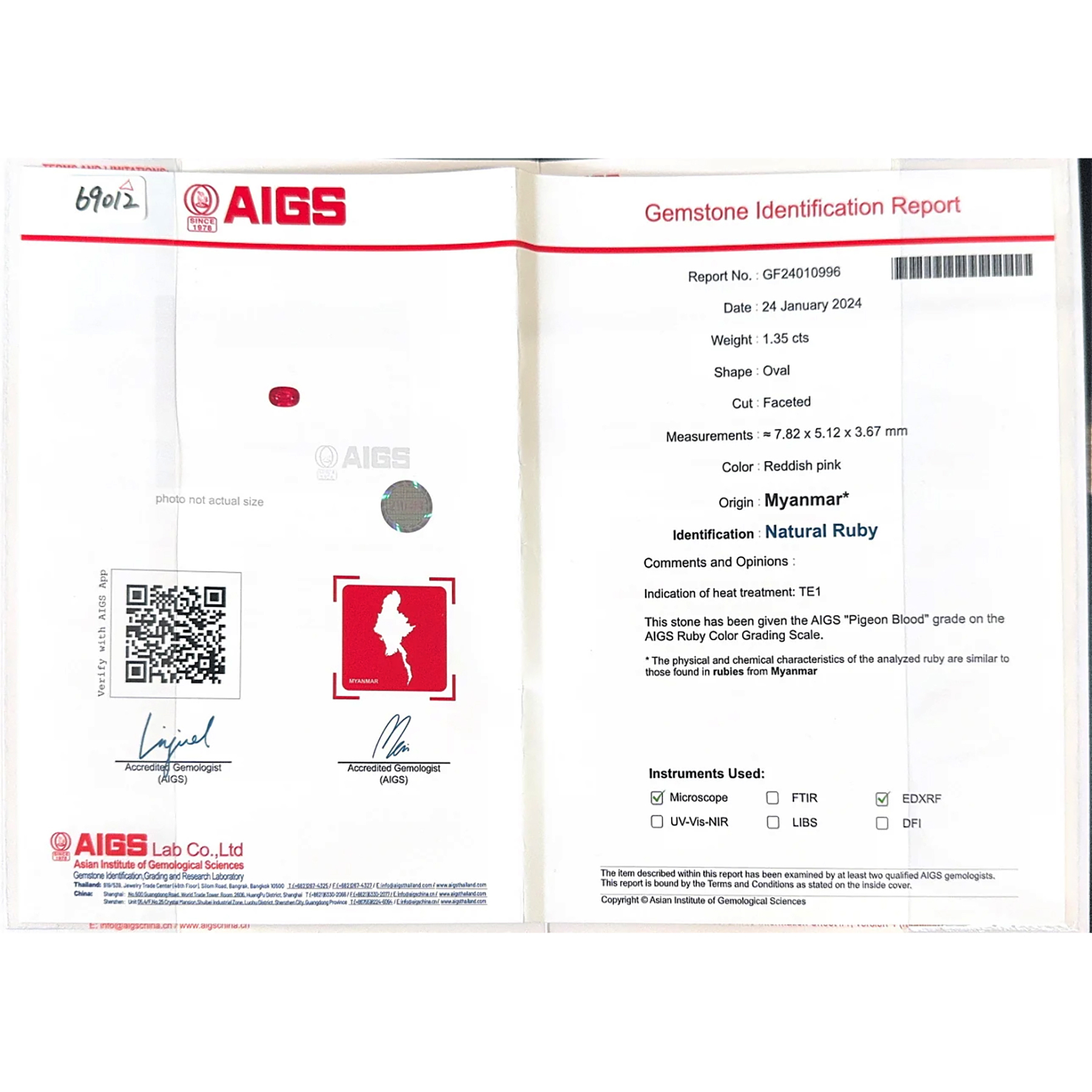 | 主石発色 | A(Pigeon Blood) |