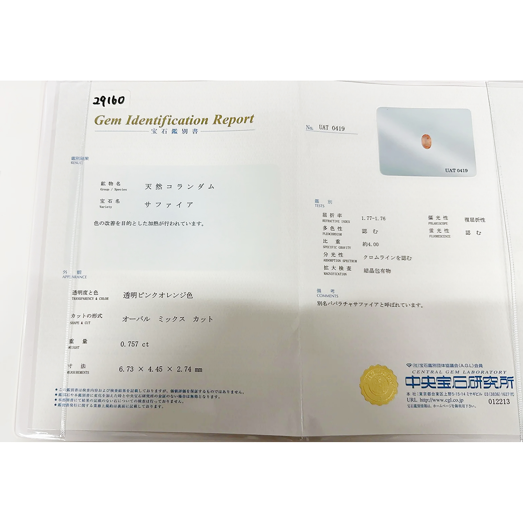 パパラチャサファイヤペンダント PT850/PT900 0.757ct D0.06ct