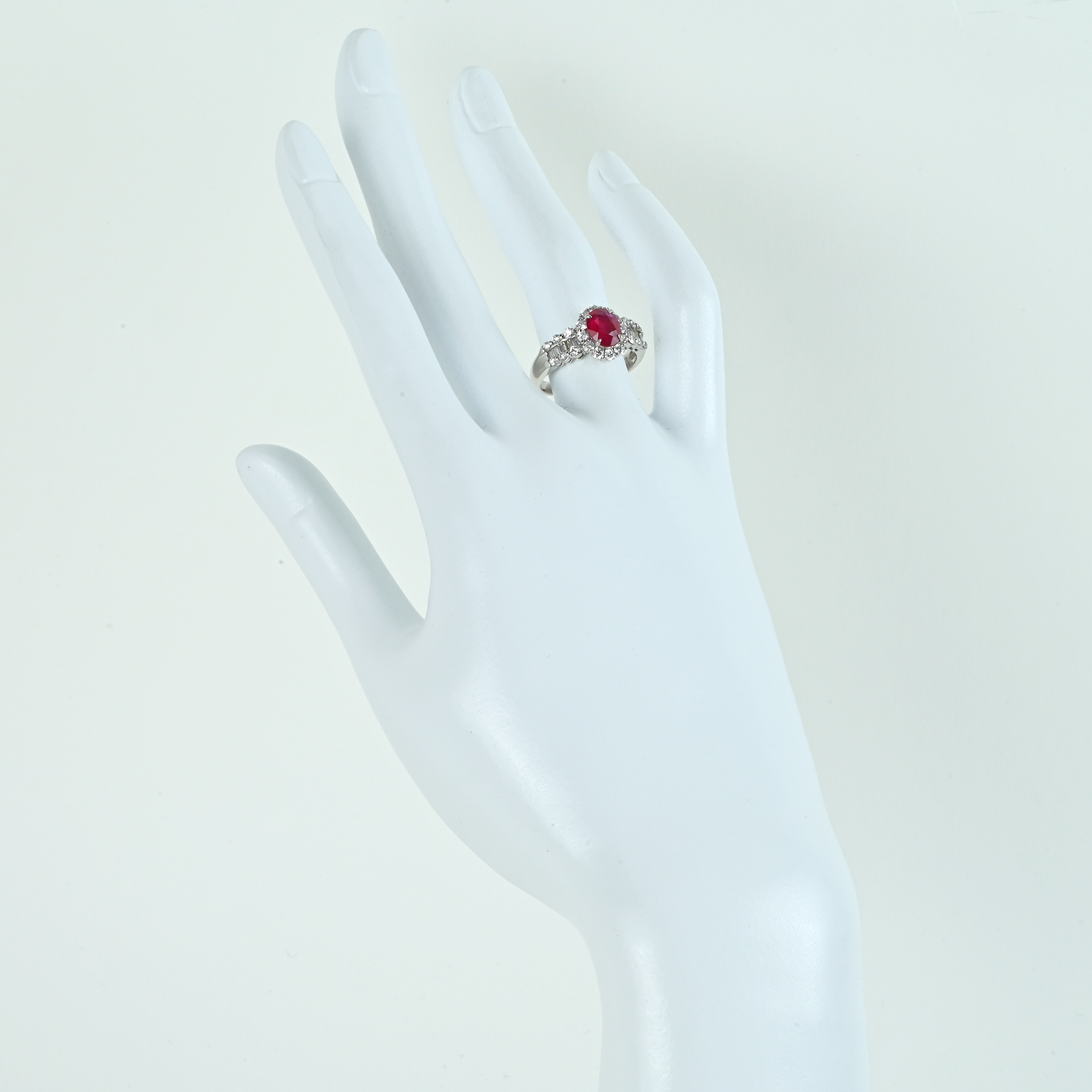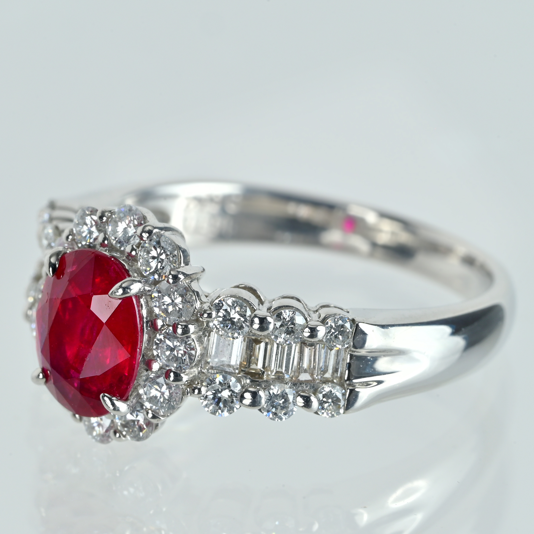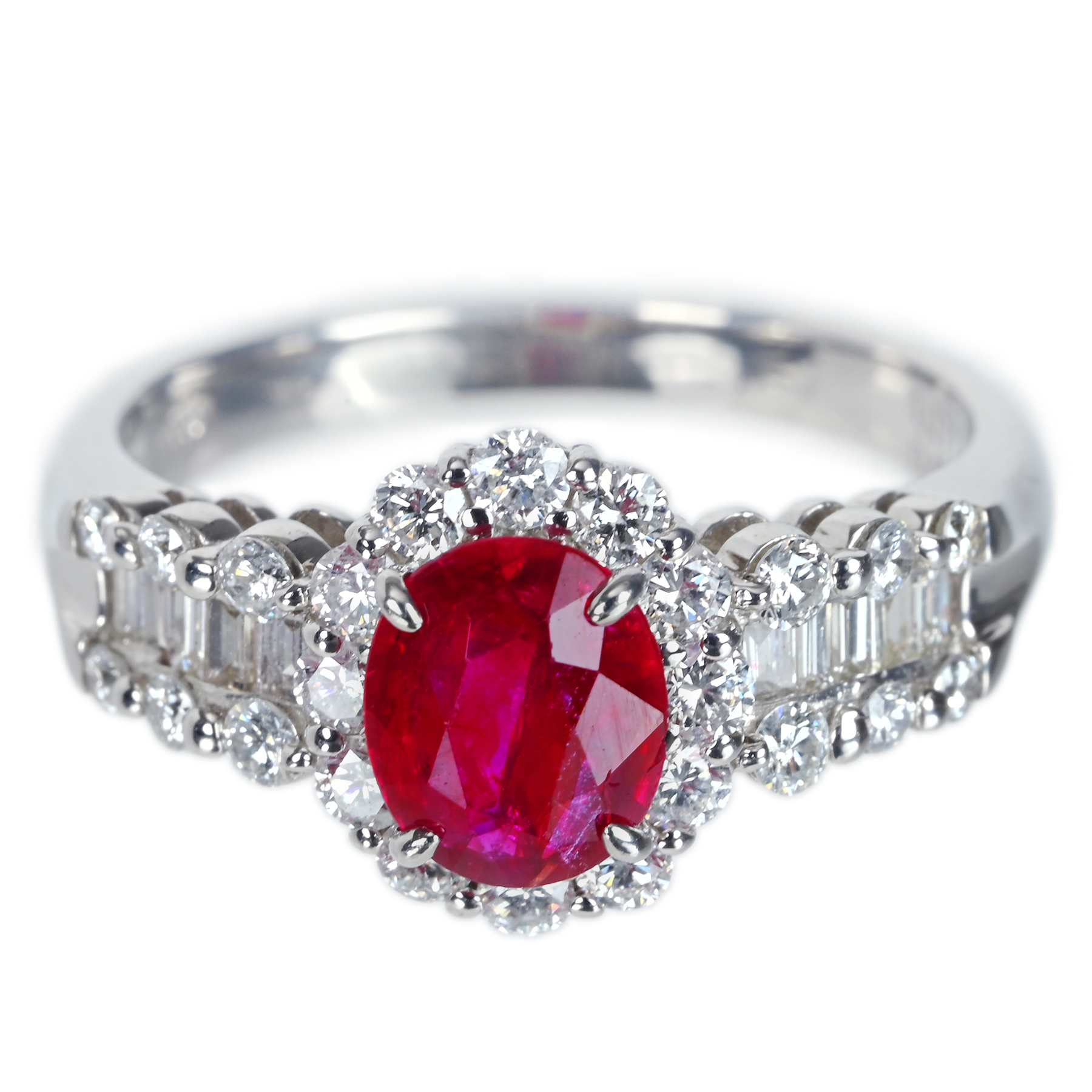 鮮やかなレッドが視線を奪うルビー1.077ctをメインに据え、ダイヤモンド0.72ctを添えたPT900リング。芯に濃さを残しつつ、奥から強く返るテリが色を押し上げ、インクルージョンの表情さえも華やぎへと変える。オーバルの輪郭が取り巻きを細く整え、中心の赤へと光を集める一品。