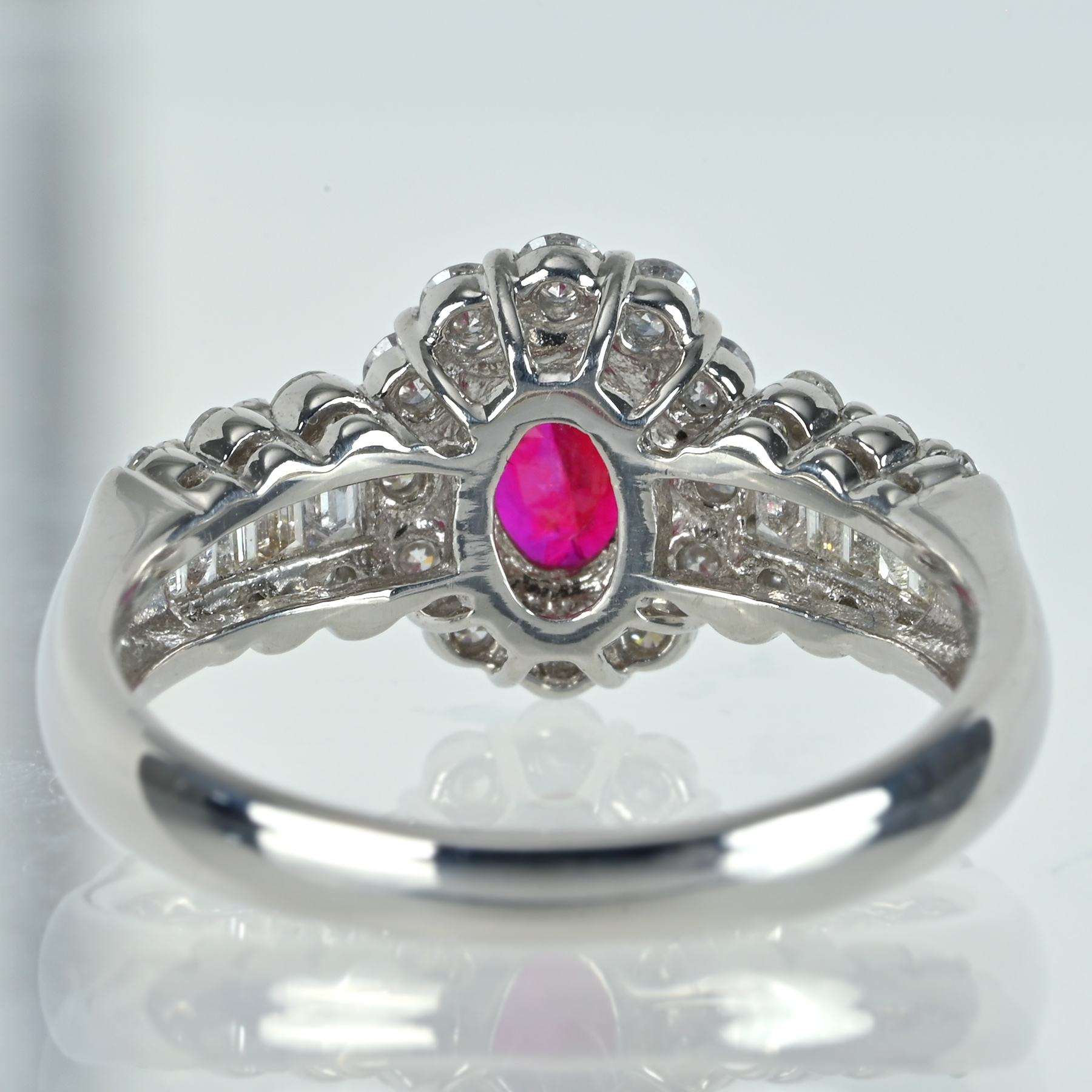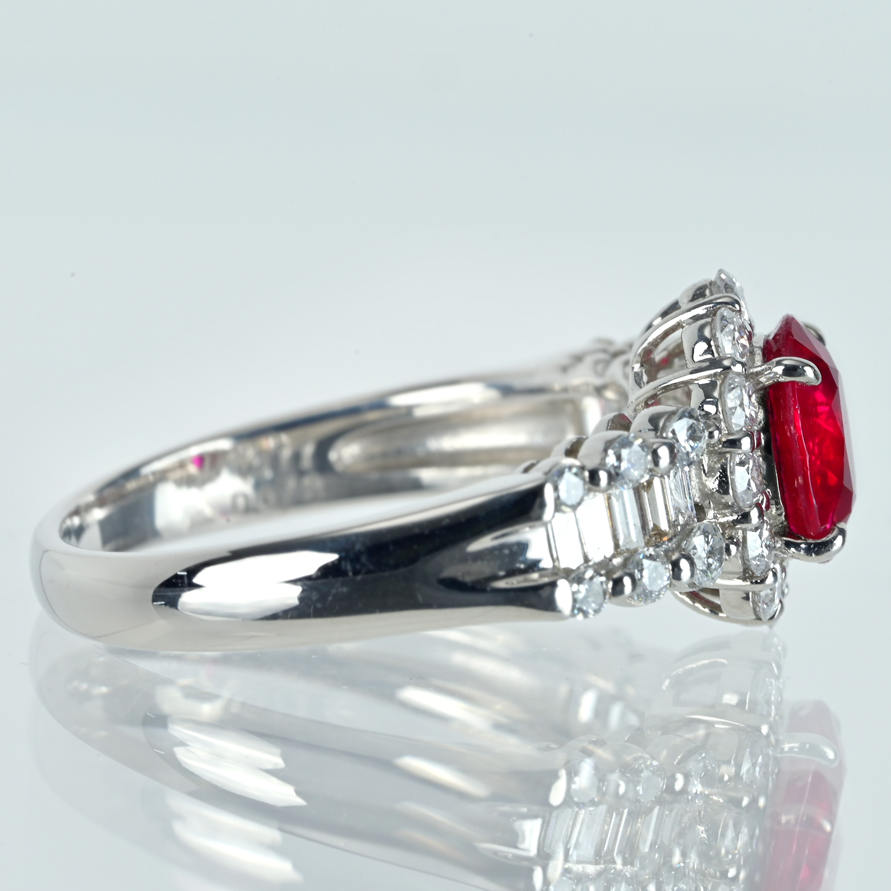 鑑別書の「非加熱」表記が加熱に頼らない発色の伸びを支え、両脇のバゲットとラウンドが透明な輝きを段階的に繋ぎ、立体の華を描く。プラチナの艶が全体を研ぎ澄まし、装いにも静かな品格。アンダーの余白が輝きを呼び込み、総重量5.8gのバランスが指元に落ち着き、静かに深紅の余韻を残す。