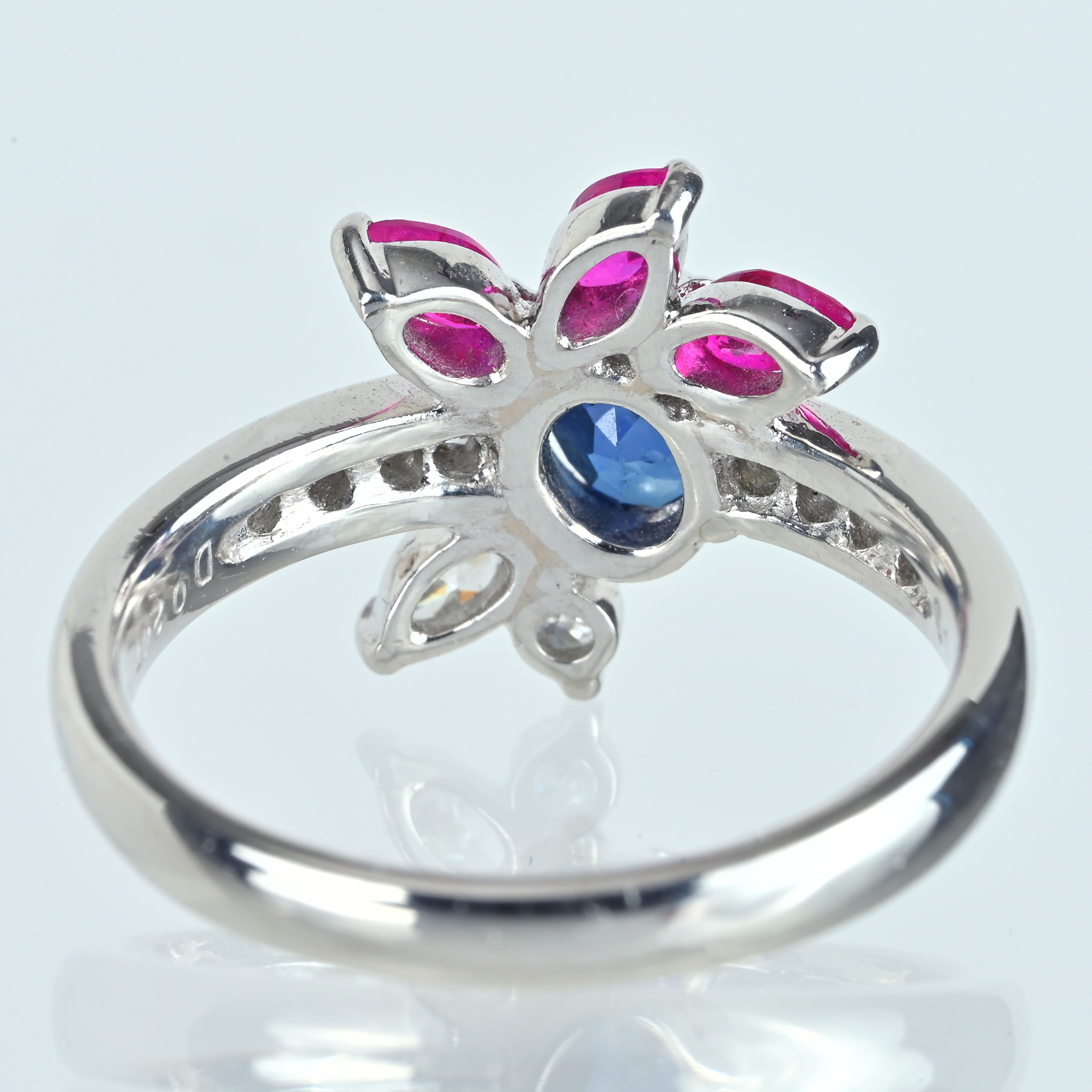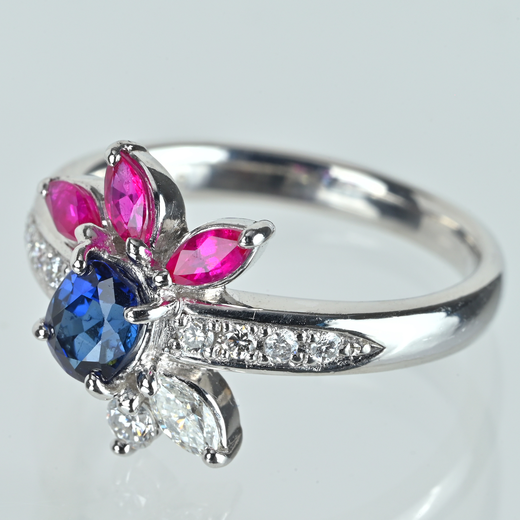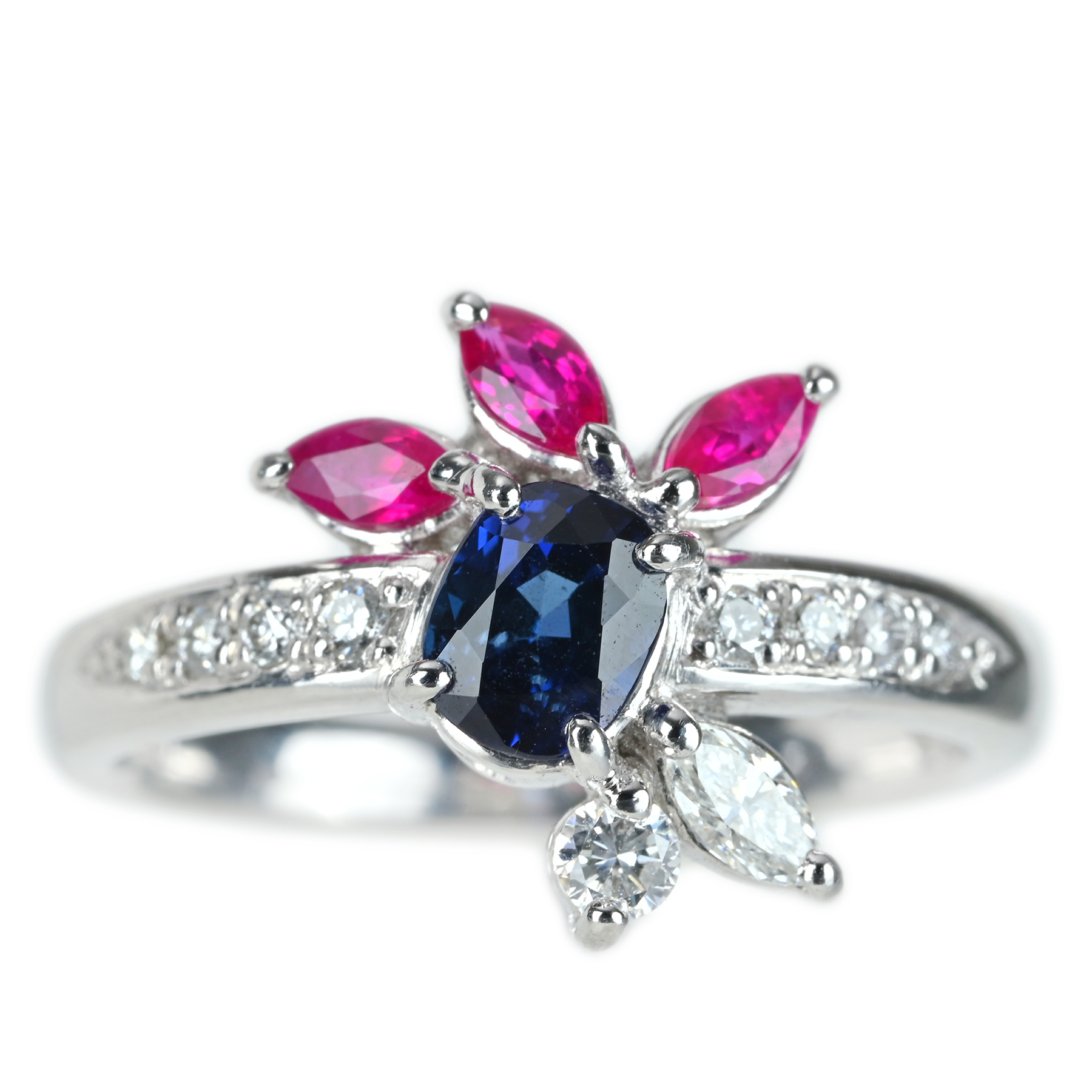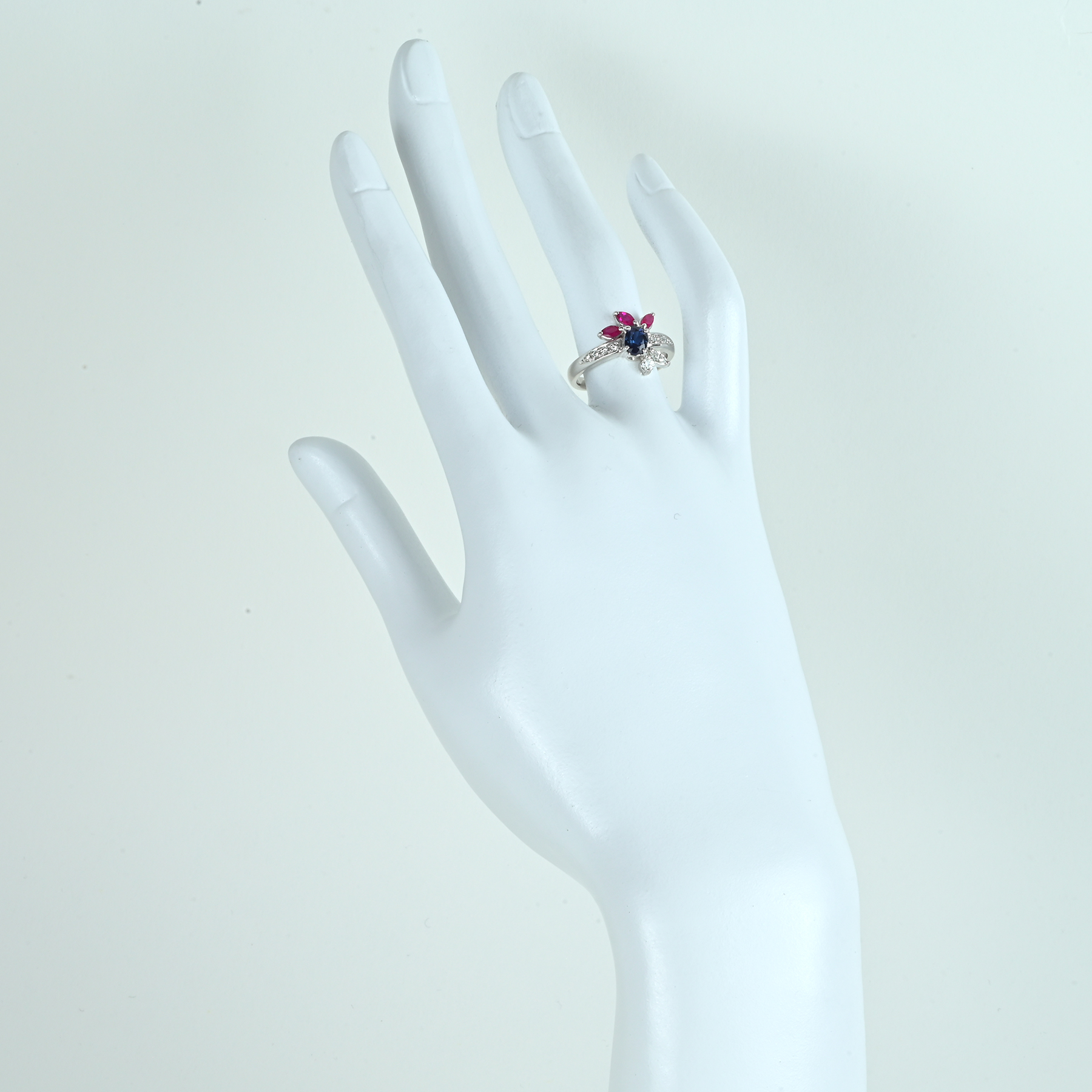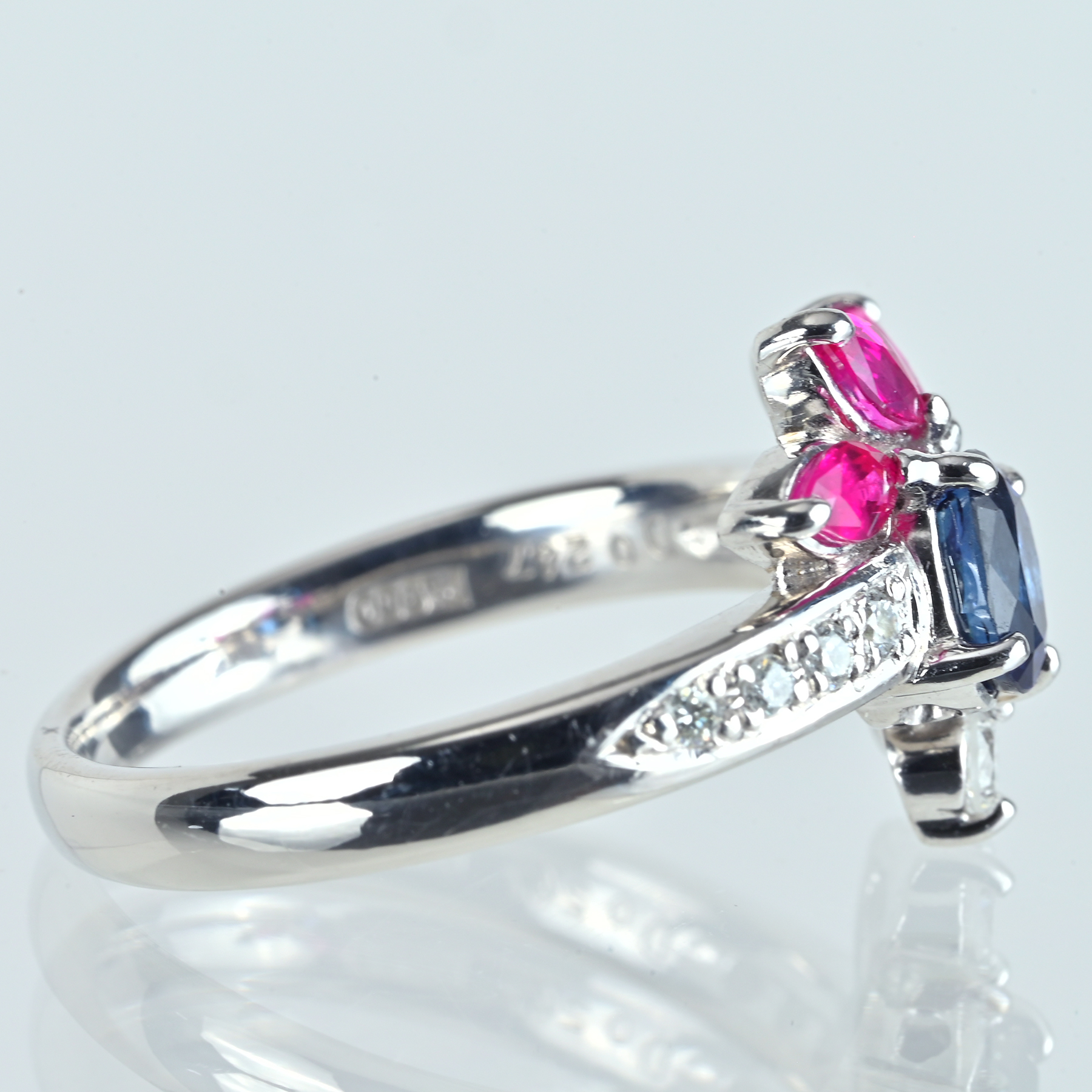 深い青を映す0.73ctのサファイアを主役に据え、ルビー3石(計0.40ct)が、ほのかに紅色を帯びた彩りを添えるPT900リング。ダイヤモンド10石で計0.247ctをあしらい、色合い、透明感、テリも上質。光の粒として手もとに残る。プラチナの澄んだ白い艶が輪郭を整え、サファイアとルビーの彩りをすっきりと引き立てた一品。